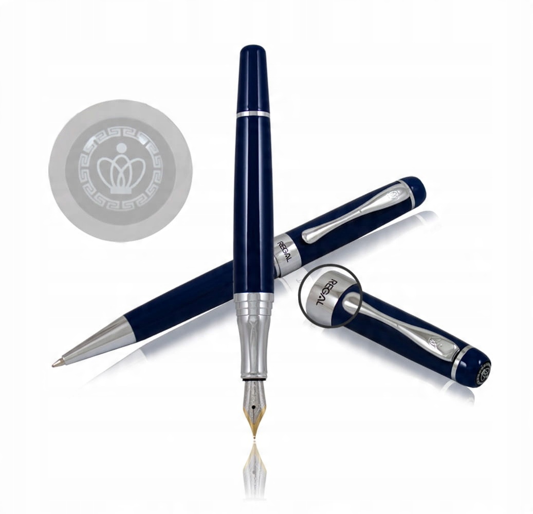 Элегантный набор REGAL «Андрей» в синем и серебряном цвете, в который входит ручка с серебряно-золотым пером (1,8 х 0,8 см), украшенная гравировкой эмблема бренда Regal. Шариковая ручка с выкручивающимся стержнем.