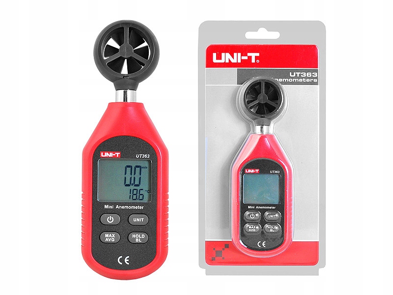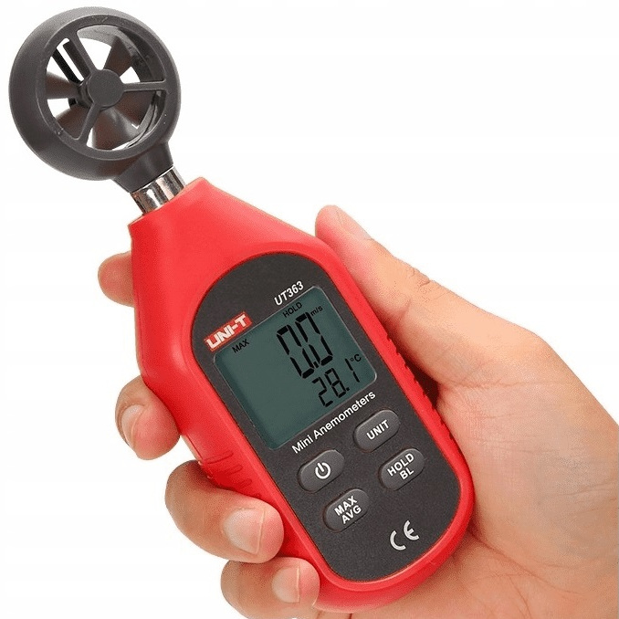 Анемометр с 6-спицевым ротором, используемый для измерения скорости ветра. Измеритель оснащен небольшим дисплеем, на котором отображаются результаты измерений. Датчик ветра позволяет выбирать из пяти единиц скорости. Uni-T UT363 дополнительно имеет функцию измерения температуры. Устройство питается от трёх батареек ААА, входящих в комплект.