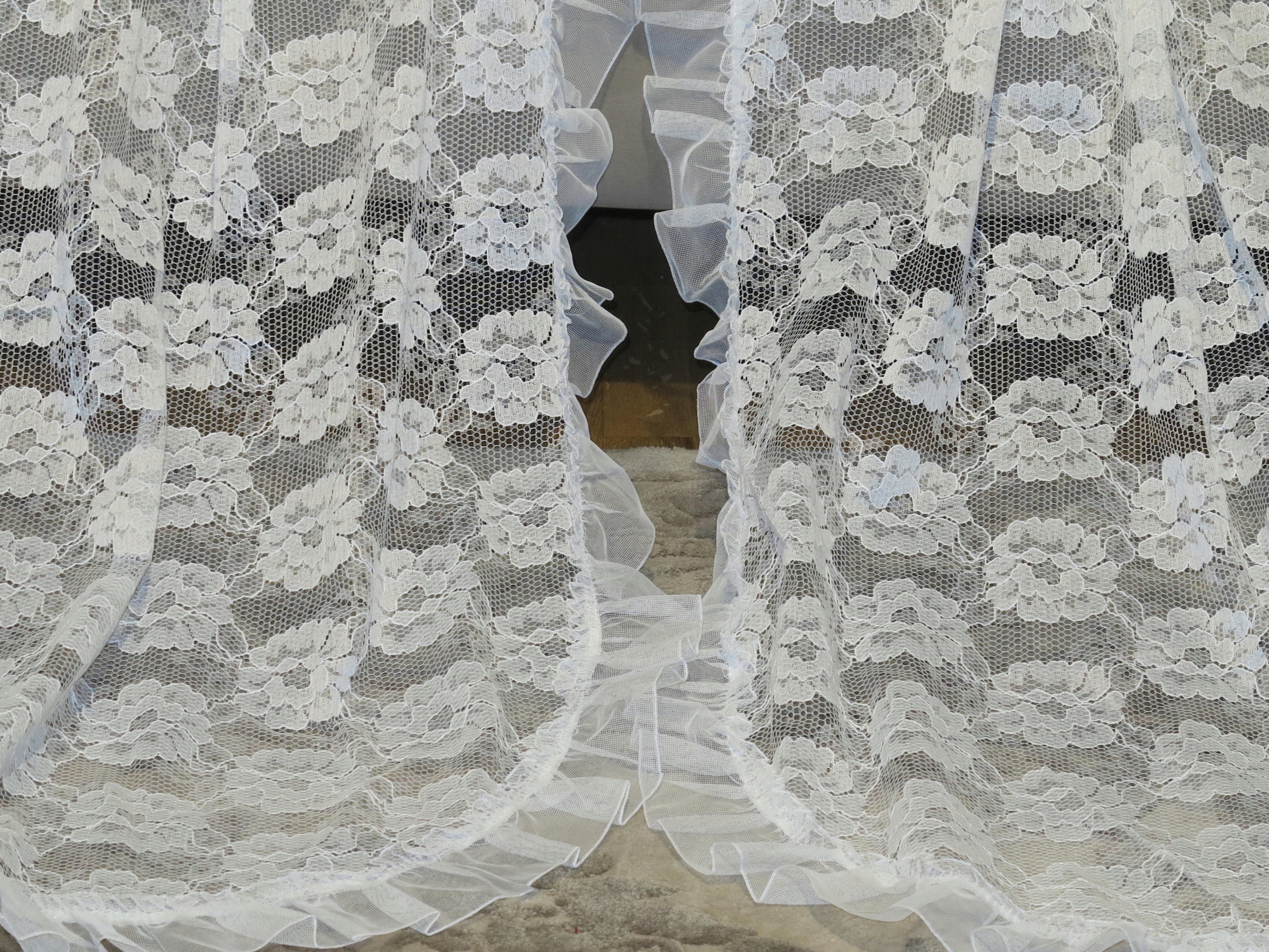 английский, очаровательный, кружево белый занавес, состоящий из двух отдельных половинок с излишеств. Соединение с оборками. Кружево не требует глазного, мягкого- 100% полиэстера