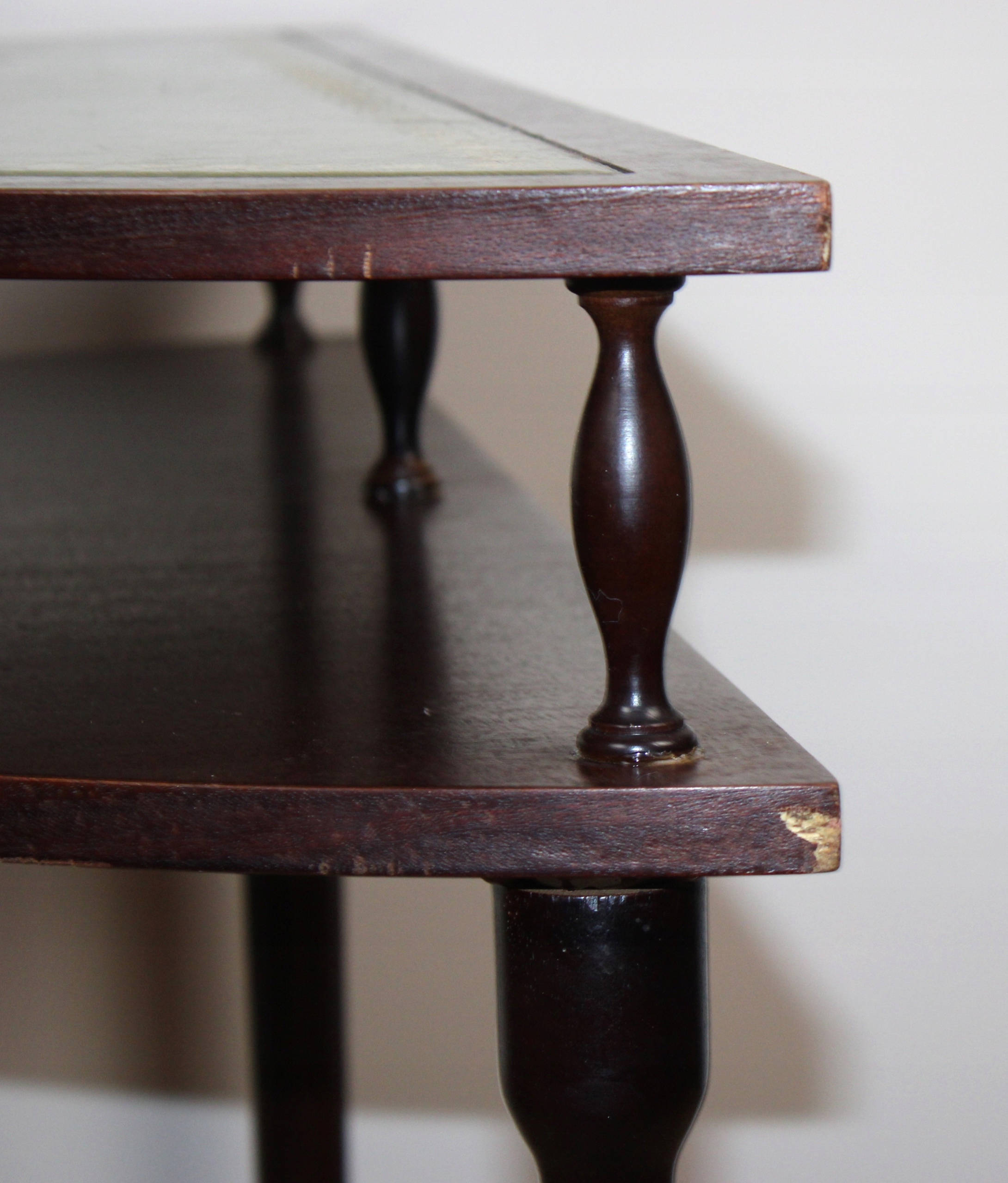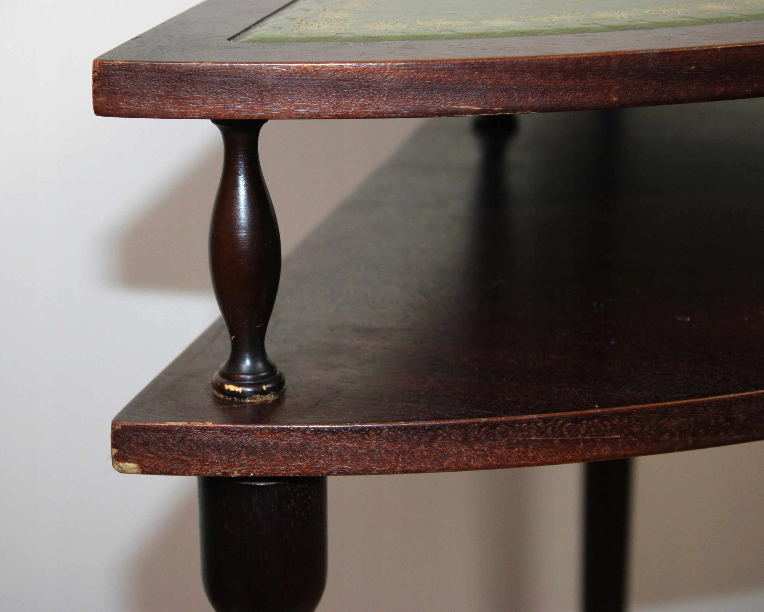 Стильный консольный столик в английском стиле. Столешница обтянута зеленой кожей с золотым узором, состояние очень хорошее. Дополнительная полка под столешницей. Отдельно стоящий стол на трёх ножках. Ножки откручены.