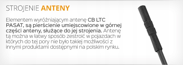 Отличительным элементом антенны CB LTC PASAT является регулируемая длина излучателя, используемого для настройки антенны. Эту антенну можно легко настроить в транспортных средствах, где это было невозможно с помощью других продуктов, доступных на польском рынке.