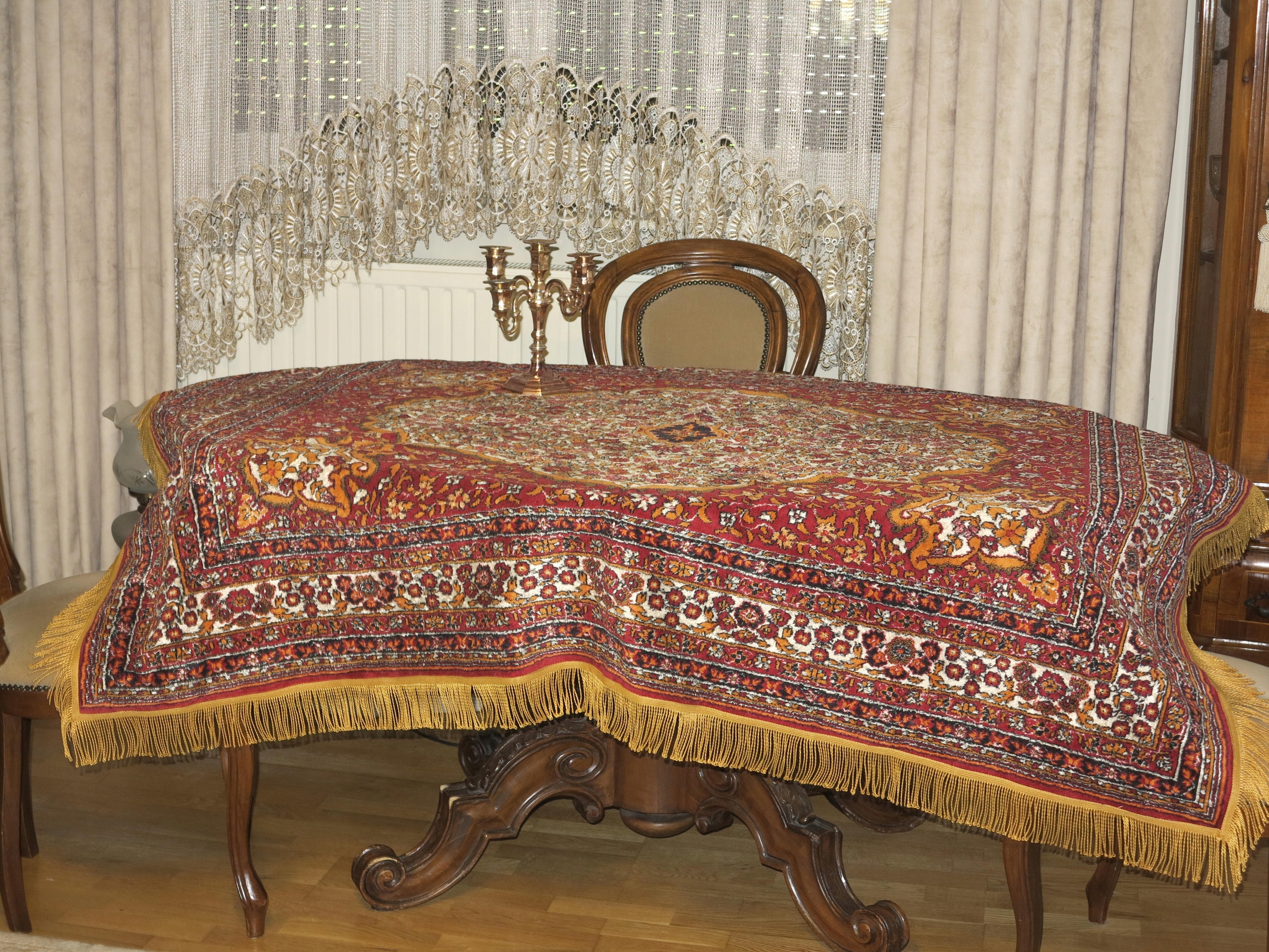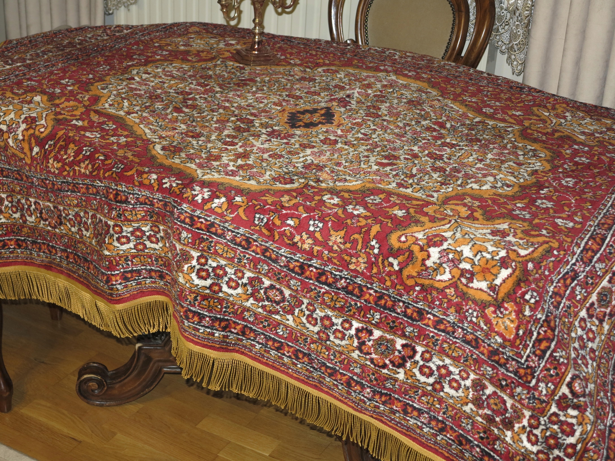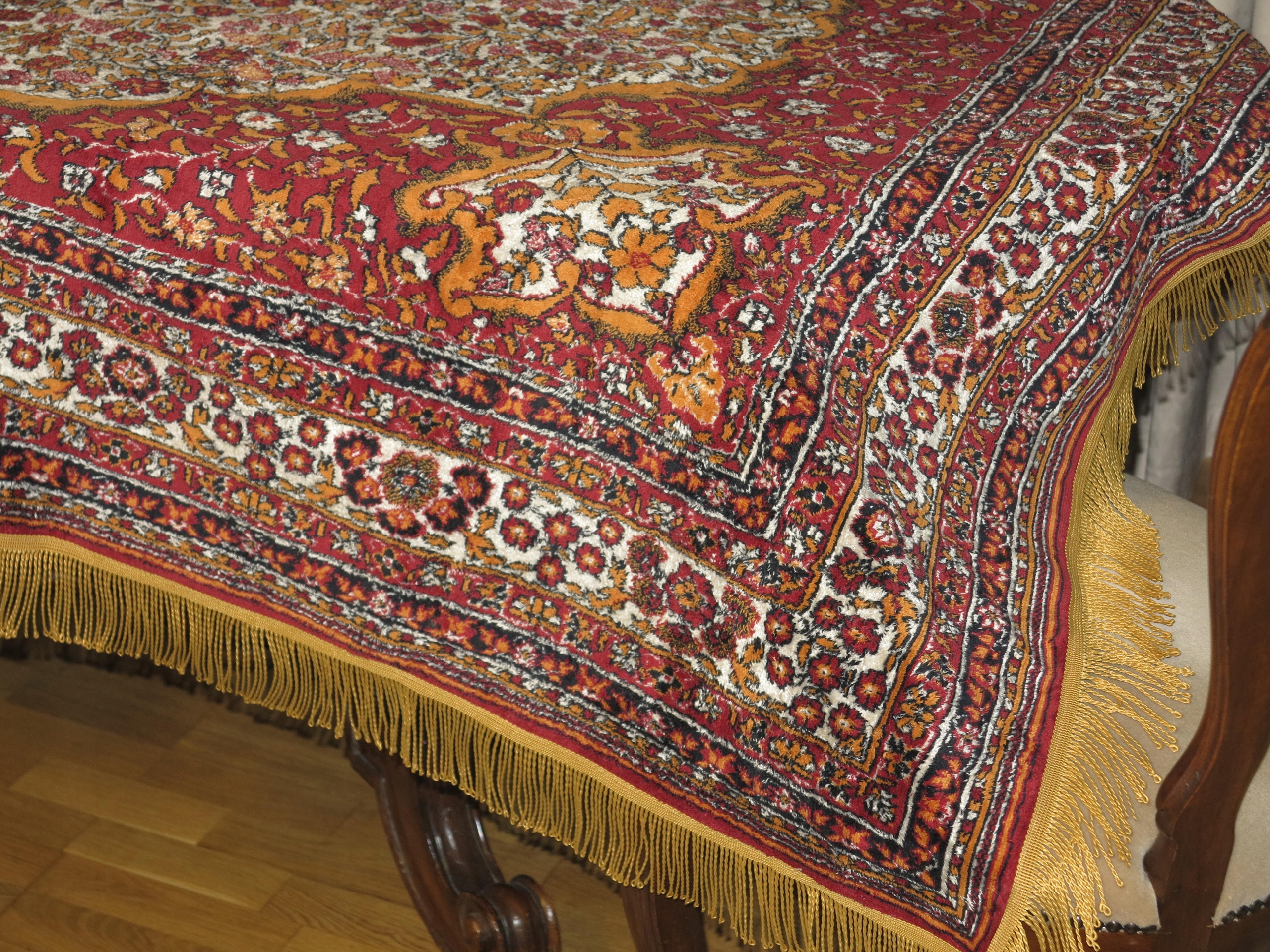 -Красивая стильная древняя скатерть, мусор из благородного толстого хлопкового аксиамита. Примерно украшен золотистыми полосами. Доминантный цвет- Бургундия