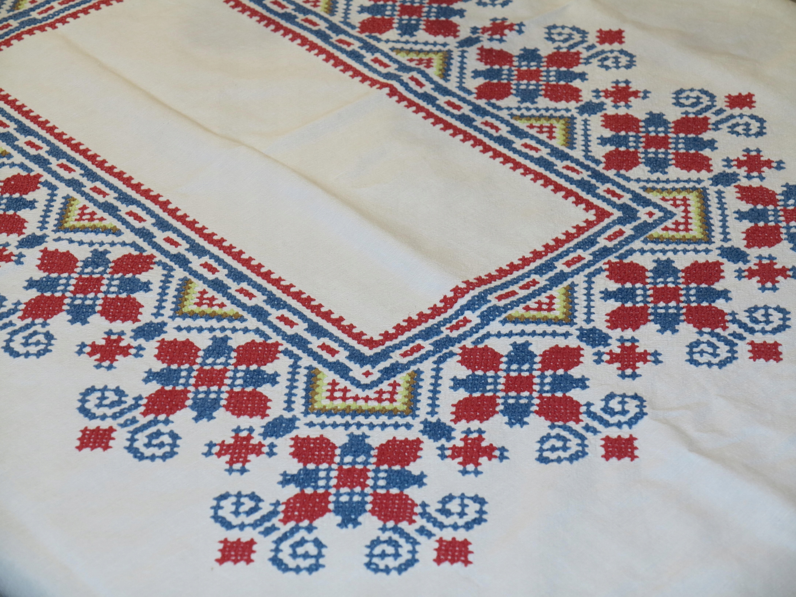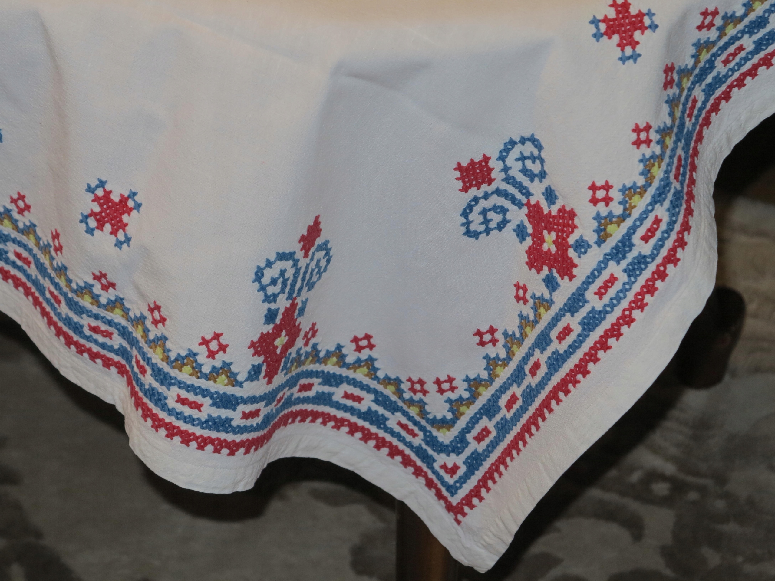АНТИКВАРНОЕ - КРАСИВОЕ СОСТАВЛЕННОЕ БЕЛОЕ ХЛОПКОВОЕ СКАТЕРЬ С ВЫШИВКОЙ РУЧНОЙ РАБОТЫ, ТОЛСТОЙ КРЕСТ-КРЕСТОМ (СИНИЙ/КРАСНЫЙ/ЖЕЛТЫЙ). ОЧЕНЬ кропотливая, трудоемкая ручная работа.