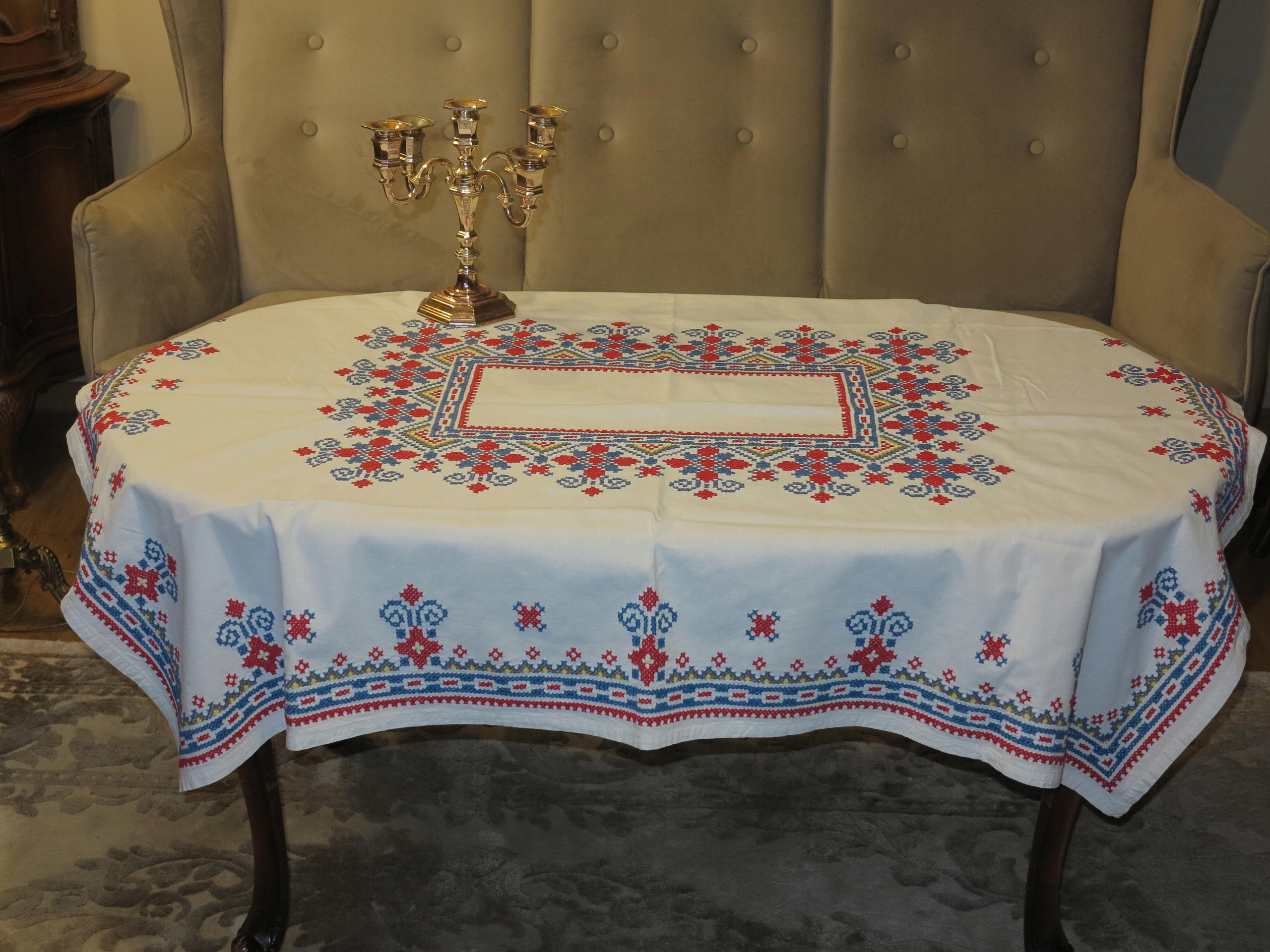 АНТИЧНА - ГАРНА СКАТЕРТИНА З РЯСНОЮ ВИШИВКОЮ ХРЕСТИКОМ СИНИЙ/ЧЕРВОНИЙ 137/114