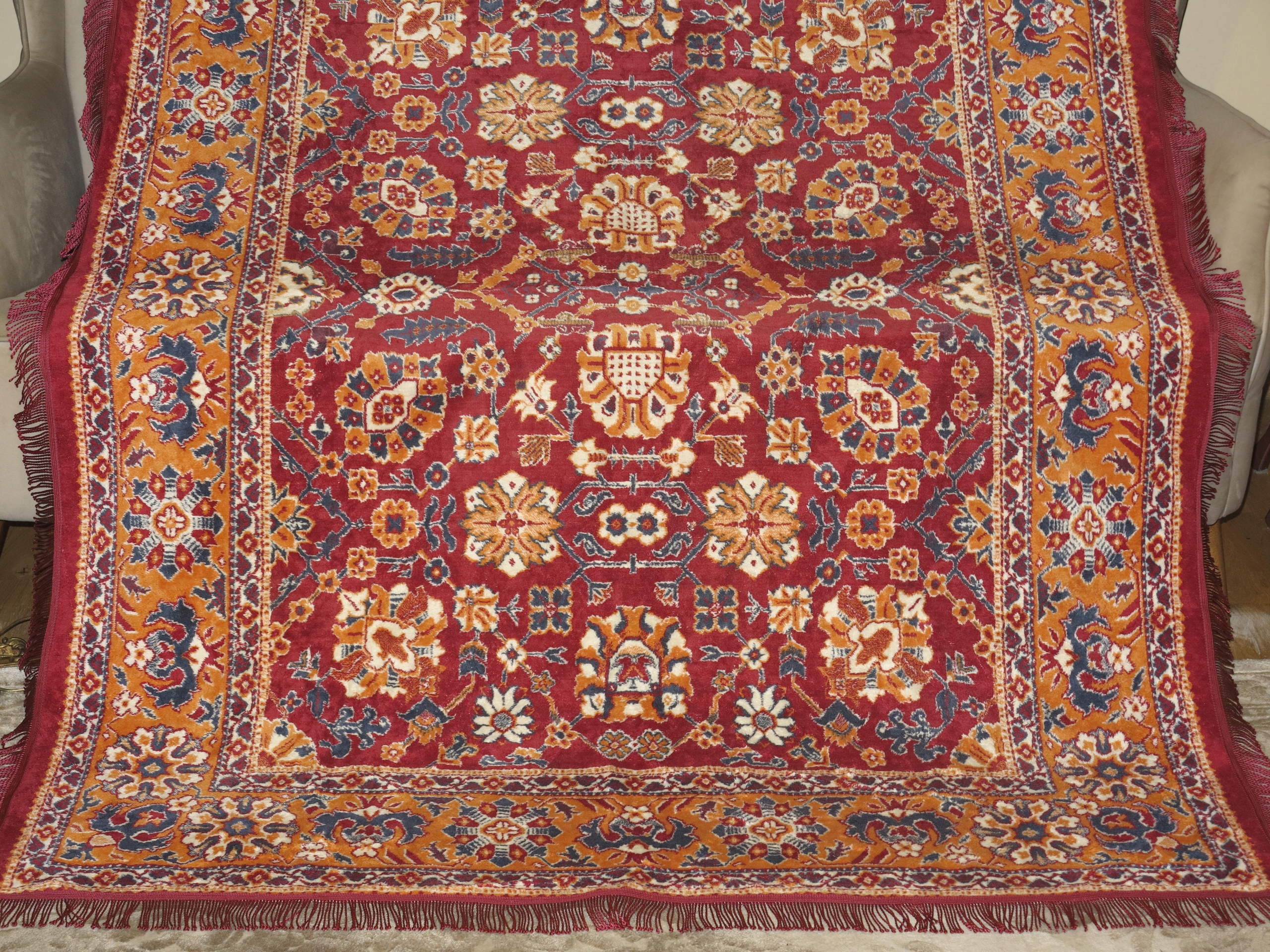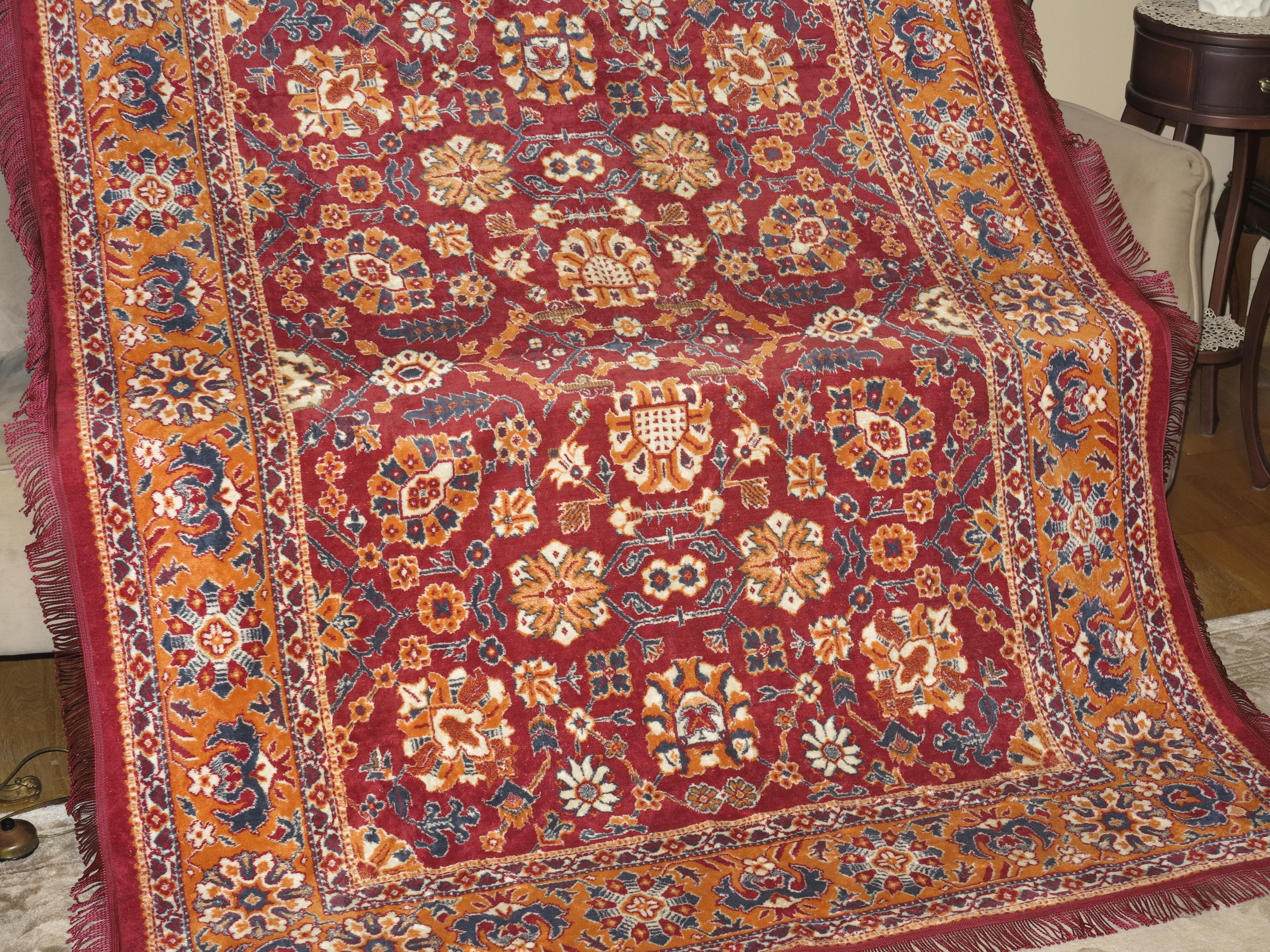 -Красивая стильная древняя скатерть, мусор из благородного толстого хлопкового аксиамита. Примерно украшен полосами. Доминантный цвет- Бургундии