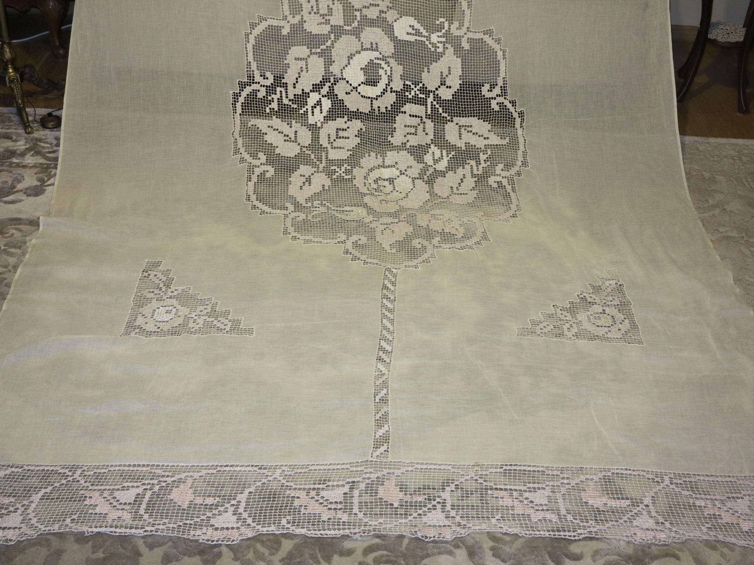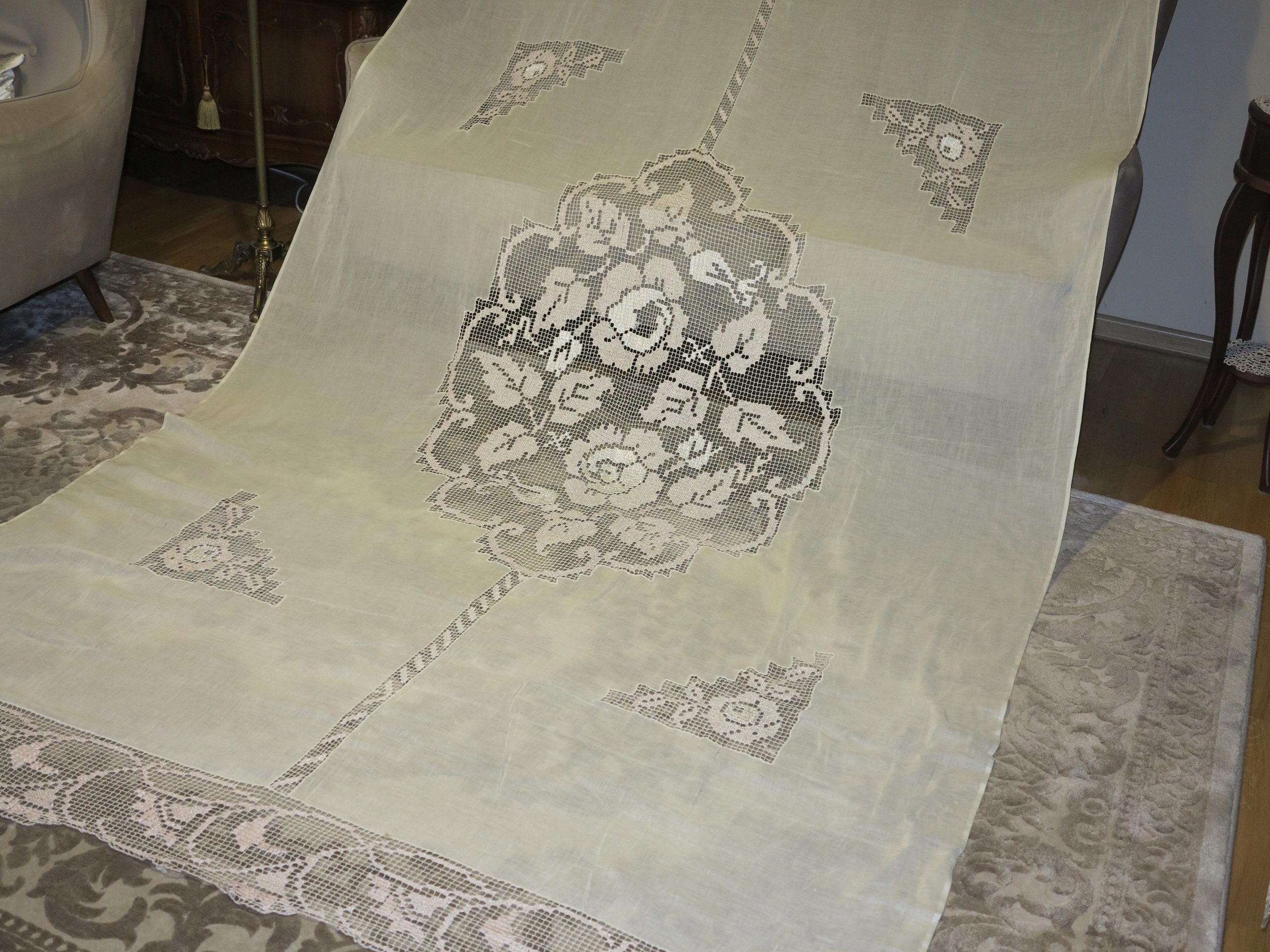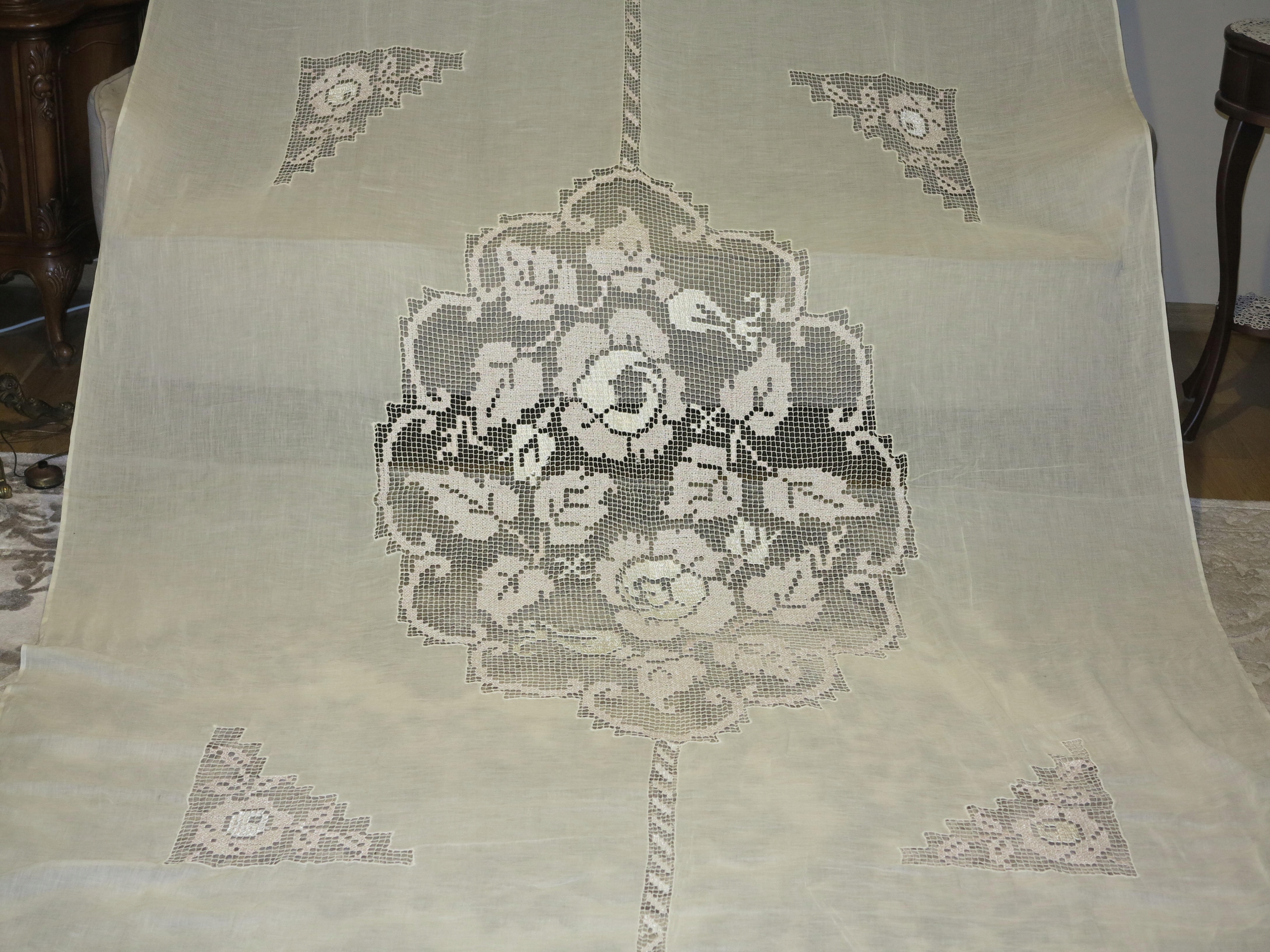 анти-единый, красивый, вековой, огромный муслин-ночная скатерть, накидку или занавес с большим медальоном в середине-сам медол составляет 115 см длиной Полем Ручные схемы дюбеля, изготовленные из хлопковых нитей, муслин также хлопка. Кремовый цвет/jaśniusienki теплый бежевый