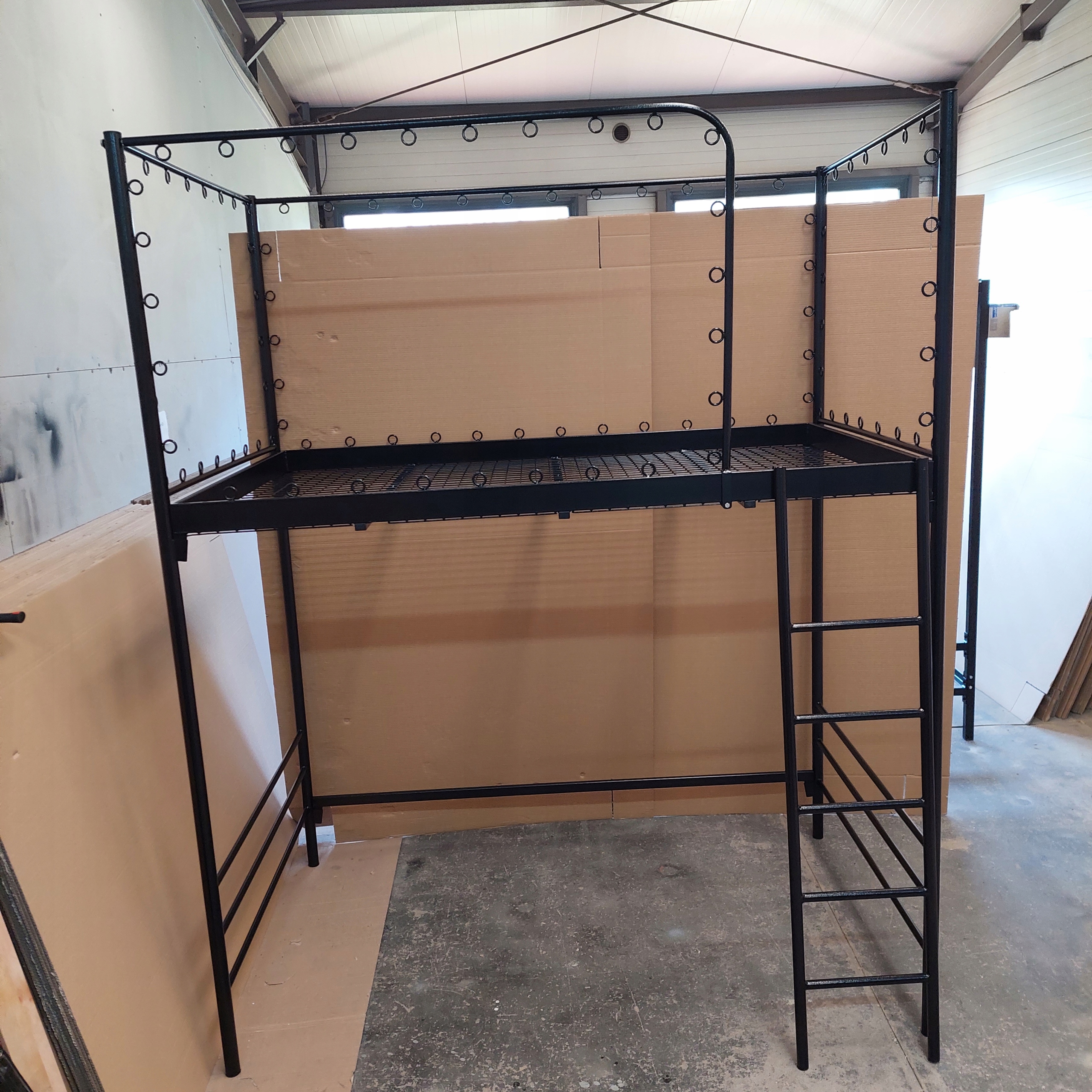 Каркас кровати изготовлен из металлической сетки с перекладинами вдоль сетки.