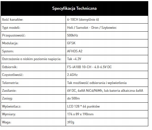 Передатчик с выбором количества каналов от 6 до 10 (по умолчанию 6), предназначенный для дистанционно управляемых летающих моделей - планеров, самолетов, вертолетов и т.п. Передатчик имеет четкий ЖК-дисплей с подсветкой. Устройство работает в системе AFHDS/AFHDS2 на частоте 2,4 ГГц. Цифровая триммировка и простое программирование отличают этот передатчик от других моделей, а комфорта также добавляют переключатели и ручки изменения режима полета, настроек закрылков и т. д. Кроме того, передатчик можно расширить за счет дополнительных приемников телеметрии и широкого набора датчиков.
