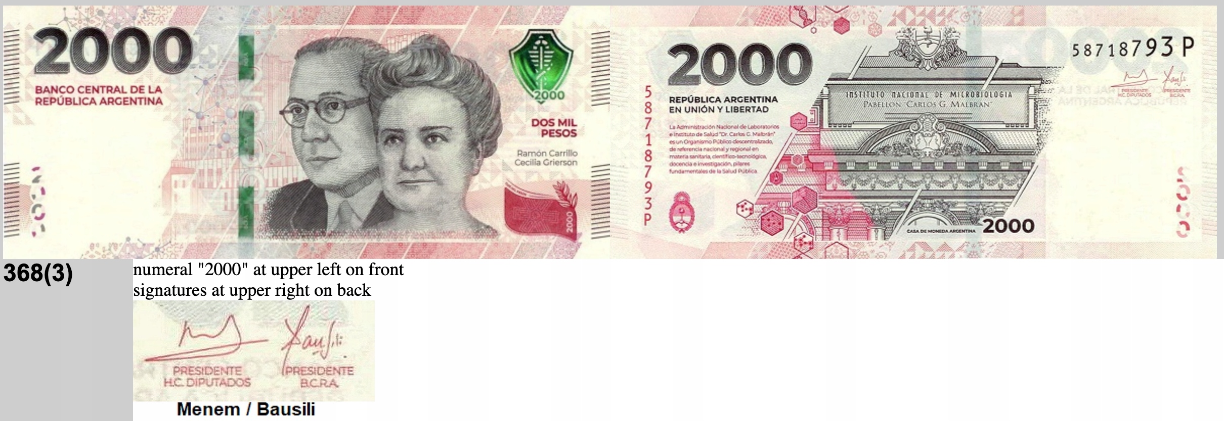 7 ноября 2023 года Центральный банк Аргентинской Республики (Banco Central) de la República Argentina, BCRA) представила новую банкноту номиналом 2000 аргентинских песо