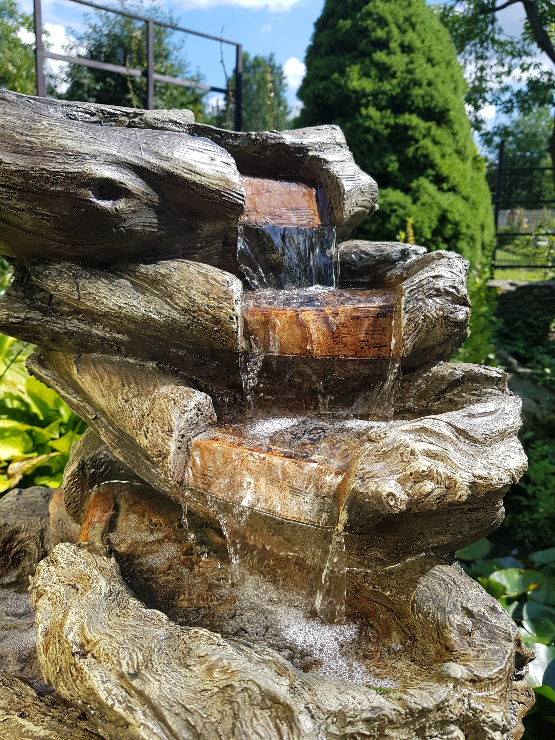 Стилизованный в форме подключенных кусочков дерева, теплых цветов и интересная форма, подражающая каскаду, добавляет очарование. Фонтан локально покрыт искусственным мхом, особенно в нижних частях. Его высота позволяет вам установить его на увеличение типа, также поместится во внутренний дворик. Каждая чаша выделена теплыми цветами светодиодного освещения каждый вечер дает удивительный эффект и позволит вам создать приглушенное настроение в саду. Этот деликатный звук плавного потока не только расслабляет, но и увлажняет воздух.