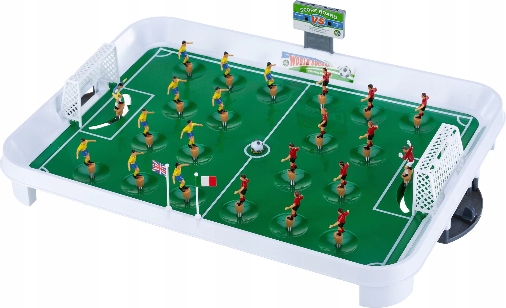 - В комплект входят: футбольное поле, 22 игрока, включая двух подвижных вратарей, два флагштока, наклейки с флагами стран, табло