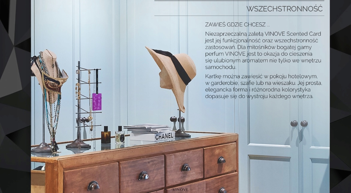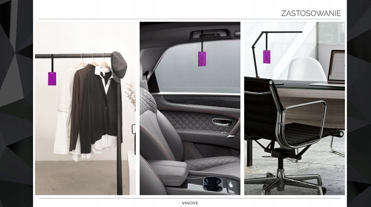 VINOVE — новый бренд автомобильной парфюмерии, созданный польскими энтузиастами в сотрудничестве с французскими мастерами парфюмерии и итальянскими дизайнерами и учеными. VINOVE – эксклюзивный автомобильный парфюм. Для производства автомобильной парфюмерии VINOVE использованы технологии 21 века. Были использованы знания, открытость и опыт команды учёных, и вместе с ними ароматы были конденсированы в инновационный полимер. Их форма устроена так, что воздух из дефлекторов автомобиля мягко обтекает полимерный лабиринт, выделяя аромат тонко и надолго — до 90 дней. При разработке носителя аромата мы учитывали, прежде всего, его функциональные качества: длительное выделение аромата, безопасность для обивки и салона автомобиля, а также эксклюзивный внешний вид, соответствующий стилю современных автомобилей.