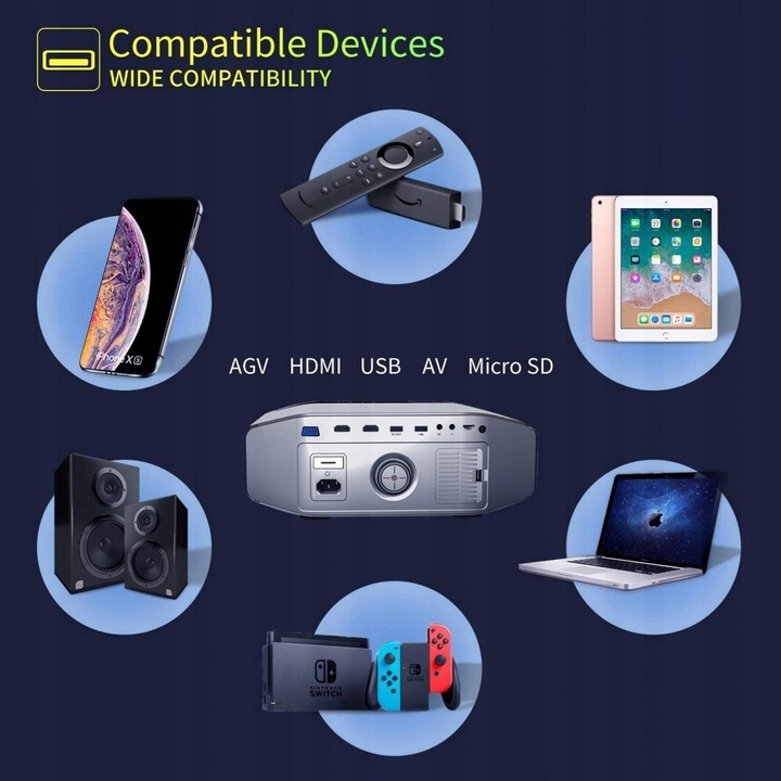 Проектор для домашнего кинотеатра Artlii поддерживает HDMI/USB/VGA/AV/SD/3,5 мм аудиовыход/Bluetooth. Его можно подключать не только беспроводно, но и проводно. б>. Благодаря дизайну портов HDMI и USB стало проще подключать телевизоры, компьютеры, ноутбуки, смартфоны, проигрыватели дисков Blu-ray, PS3, PS4, Wii Xbox и игровые консоли HDR. р>