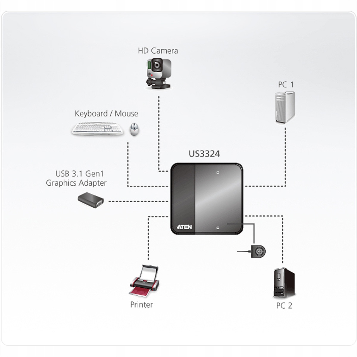 Aten US3324 — это 2-портовое устройство совместного использования периферийных устройств USB 3.1 Gen 1, которое позволяет пользователям совместно использовать четыре USB-устройства между двумя разными компьютерами с помощью кабелей USB 3.1 Gen 1 типа B — типа A.