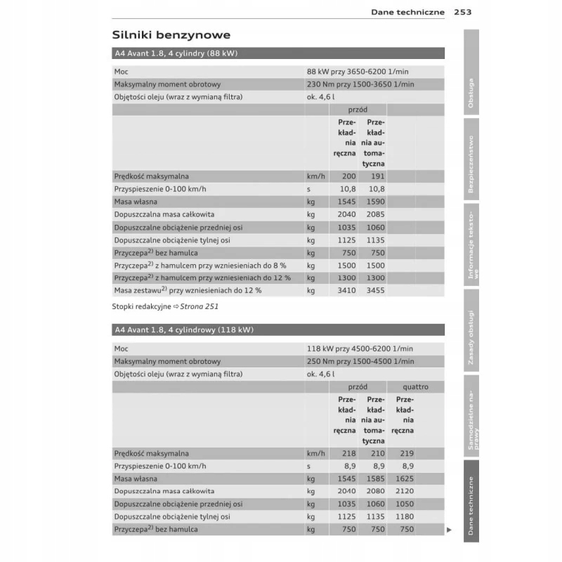 Руководство для владельца Audi содержит все версии оборудования и полезную информацию о том, как эффективно и безопасно использовать автомобиль, например: - указатели поворота, контрольные лампы, открывание и закрывание - освещение и обзорность, сиденья, отсеки для хранения вещей, отопление, вентиляция, кондиционирование воздуха. - советы по вождению, эксплуатации, обслуживанию автомобиля - уровни жидкостей, проверка и доливка, аварийные операции, замена колес, предохранителей, замена лампочек - технические данные... и многое другое, что дает путешественникам ощущение безопасности и комфорта.Польское законодательство обязывает продавца приложить к . Руководство пользователя автомобиля новое, на польском языке.