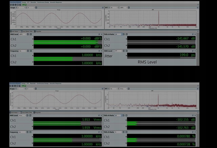 Они указывают на то, что сигнал, поступающий с цифровых выходов, характеризуется очень низким уровнем искажений (THD+N -141 дБ) и джиттером 199 пс.