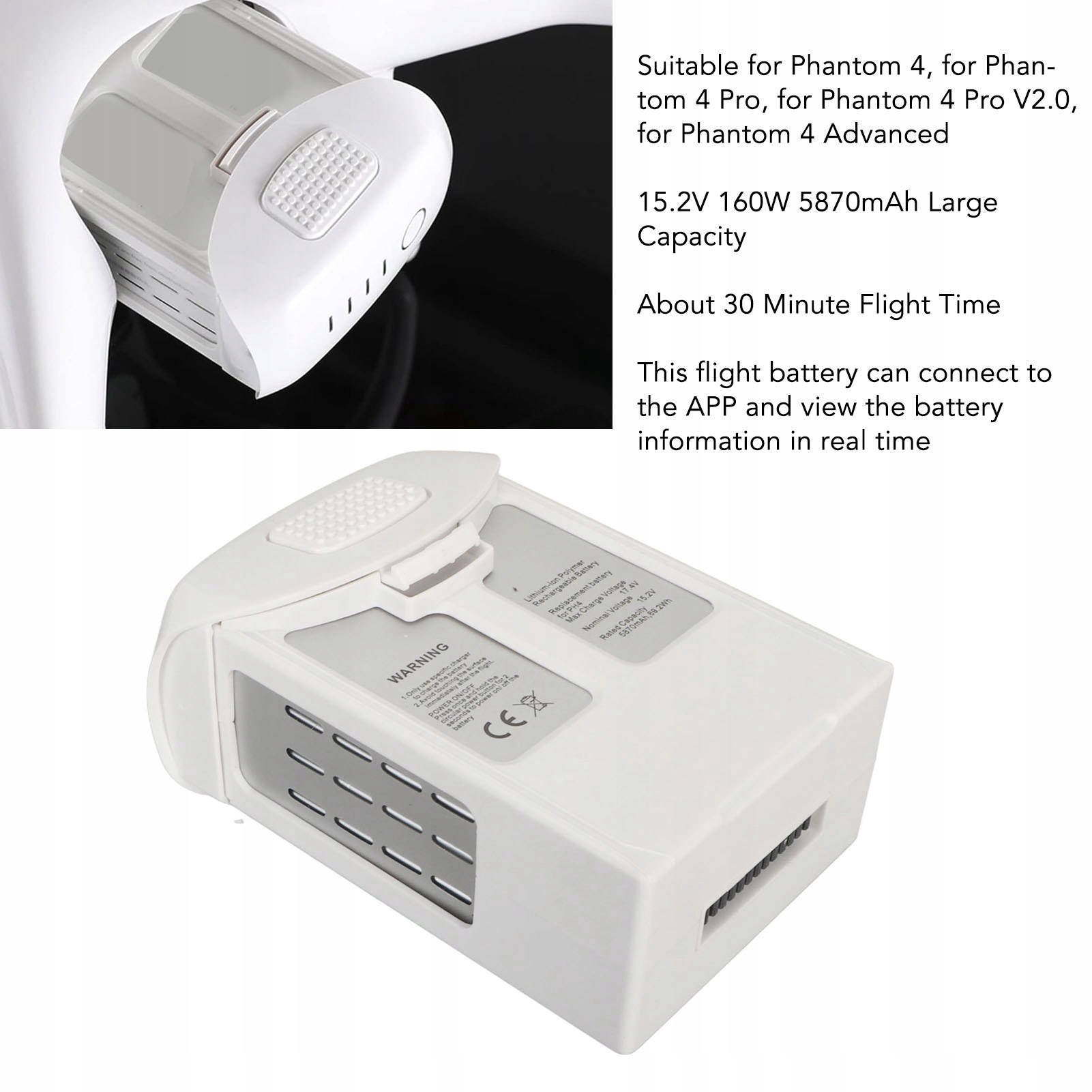 Функция: 1. Предназначен для Phantom 4: Эта интеллектуальная воздушная батарея подходит для Phantom 4, Phantom 4 Pro, Phantom 4 Pro v2.0, Phantom 4 Advanced.
