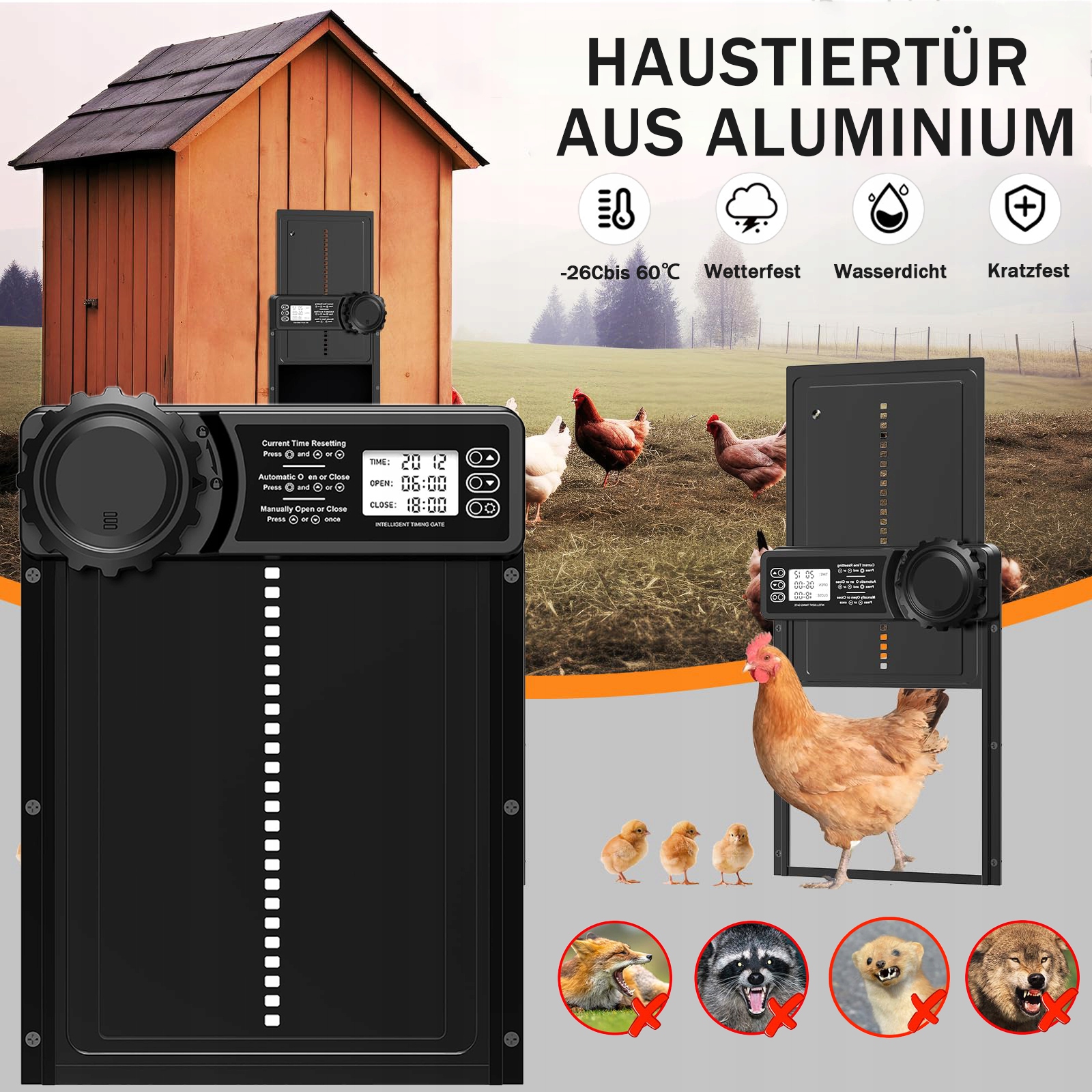 【Безопаснее и умнее】: Автоматическая дверца для курицы. Перестаньте беспокоиться о том, что ваших цыплят преследуют лисы, норки и т. д., и не позволяйте хищникам проникнуть в ваш курятник ночью с помощью наших автоматических ворот для кур!