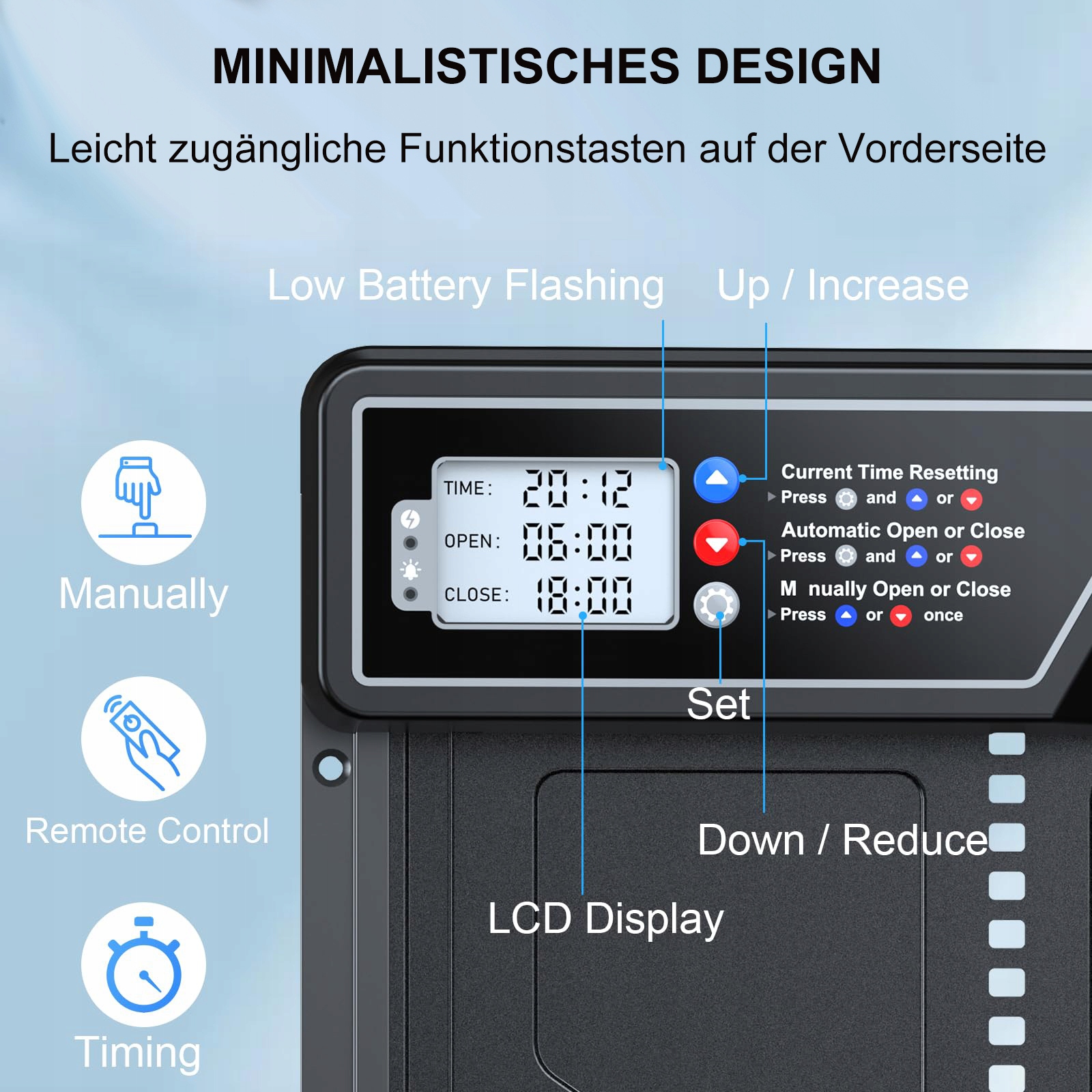 【Светодиодный дисплей】: Пользовательский интерфейс для людей всех возрастов. Автоматические двери на большую площадь, которая обеспечивает точную настройку дверного открытия и времени закрытия и световой яркости, благодаря тому, какое использование является более удобным. Независимо от того, знакомы ли вы с технологиями или только начинаете его читать, устройство было разработано для того, чтобы удовлетворить пользователей всех возрастов и гарантировать, что даже пожилые пользователи будут справляться со своей работой без проблем. Примечание. Если автоматические ворота для цыплят разряжаются, после полной зарядки аккумулятора необходимо будет сбросить вышеуказанное открытие и закрытие двери.