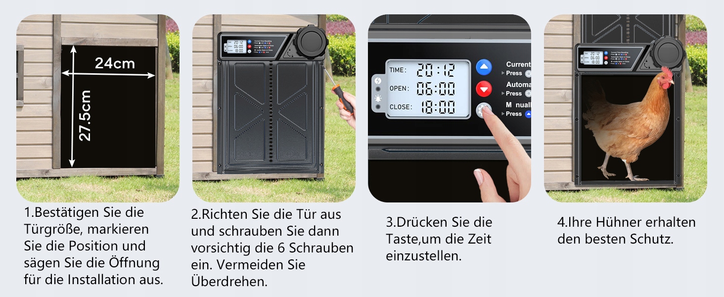 【Большой вход】 больший размер: мы расширили куриную дверь, чтобы удовлетворить потребности цыплят разных размеров и обеспечить плавный вход и выход. После открытия автоматической двери дома ширина открытия входа составляет 24x27,5 см. Прежде чем заказать наши большие автоматические двери для цыплят, измерьте отверстие в двери и убедитесь, что вы сможете установить его с помощью прикрепленных винтов. Примечание: 27 см x 36 см являются размерами продукта (включая раму и диапазон регулировки).