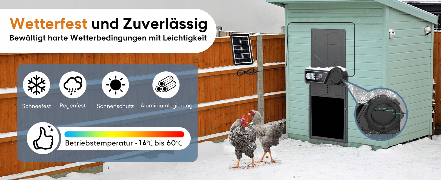 【Водонепроницаемый, прочный и простая в установке】: куриный лоскут изготовлен из алюминия + пластика, устойчивой к высоким и низким температурам, является водонепроницаемым (IP45), ветропроницаемым, устойчивым к морозам, долговечным и долговечным, вы можете использовать его при температуре -15 ℃. Автоматические куриные двери легко установить. Просто следуйте инструкциям, содержащимся в инструкциях по установке. Примечание: поручни и двери должны регулярно чистить, особенно после дождя или снега.