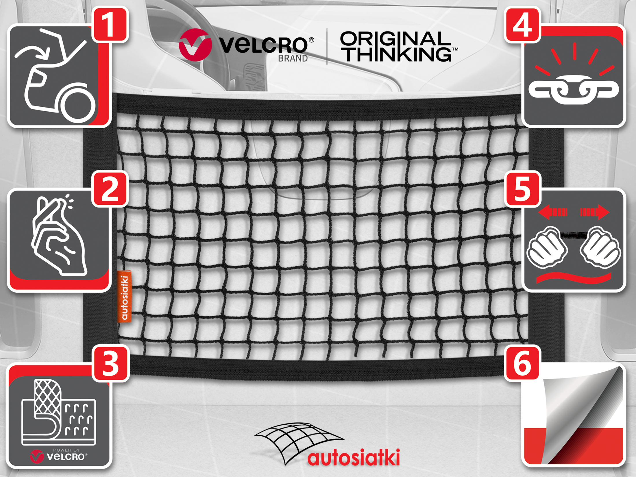 Это прочная сетка, подстриженная по бокам с сильной лентой на липучке авторитетной компании velcro ® . Вверху и снизу, завершенная с упругой резиной, которая позволяет соответствовать сетке с транспортируемыми предметами. Забор прикреплен к ковру в багажнике или в автомобильной кабине. Использование ленты Velcro ® гарантирует качество и уверенность в креплении Autosiaka.