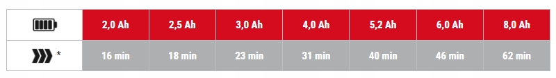 - Дополнительно можно приобрести аккумуляторы различной емкости (от 2Ач до 5,2Ач).