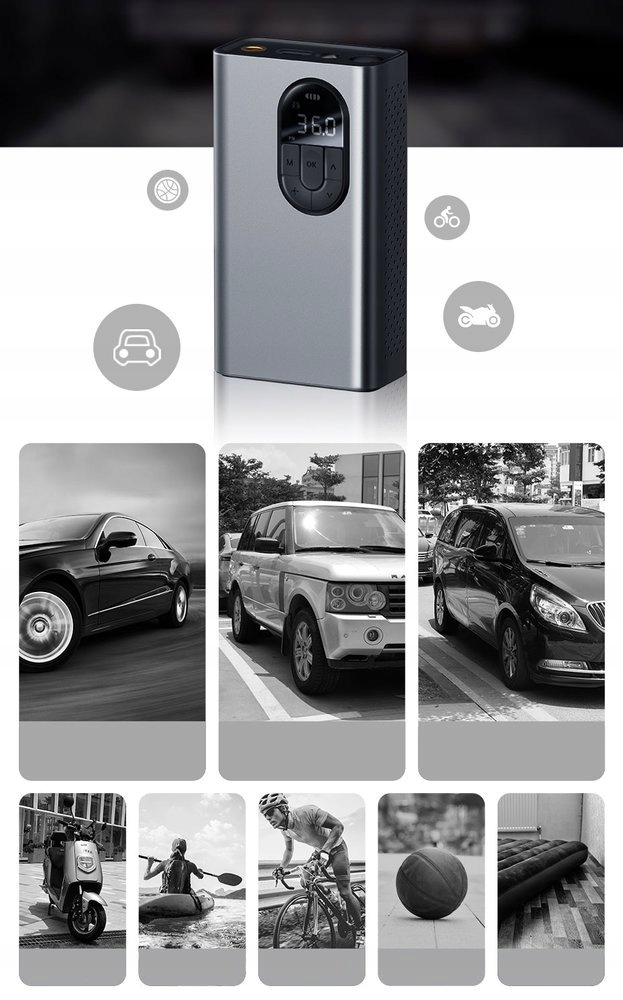Насос подходит для автомобилей, других транспортных средств и спортивных аксессуаров. Полная зарядка распространяется на: