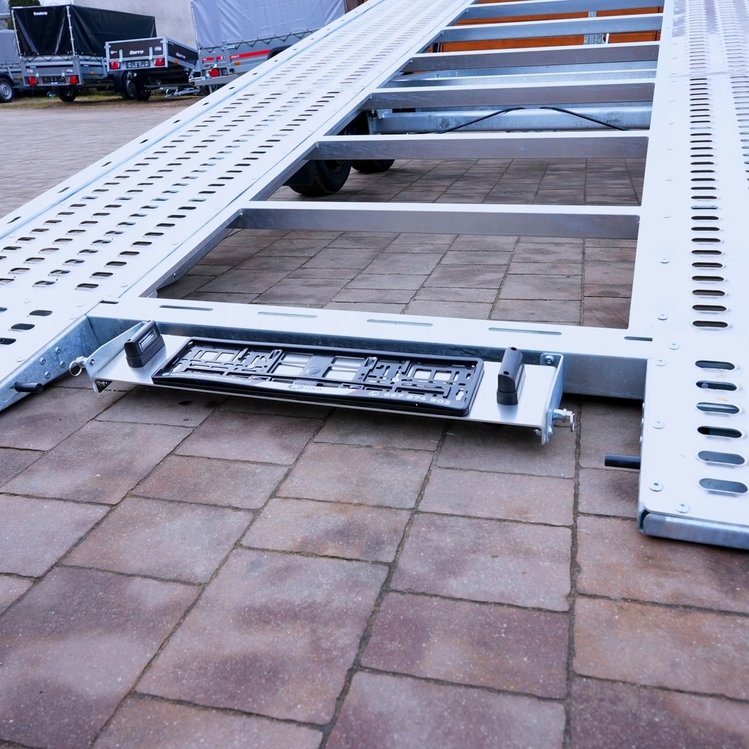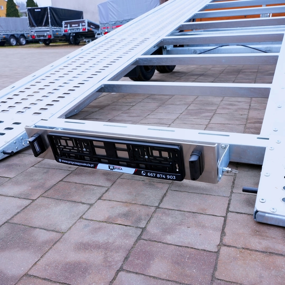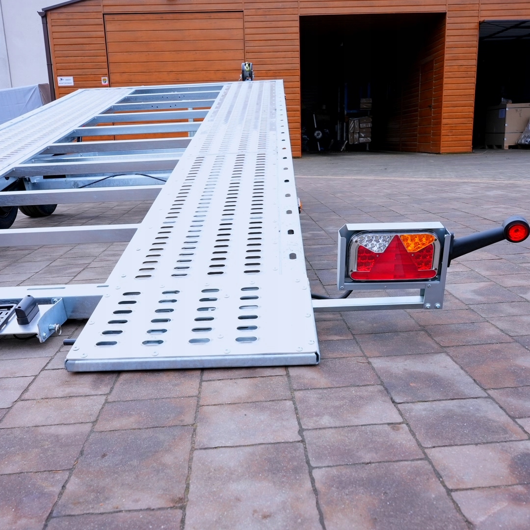 Это самый маленький из буксирных грузовиков DMC 2700 кг. Транспортное средство имеет наклонную платформу со встроенными вторжениями, которые образуют угол вторжения 13.3o. Вторжения вместе с ловушками сделаны из перфорированного и прессованного листа "Lohr". Модель оснащена системой легкой боковой стороны, которая отвечает за отверстие задней лампы, которая защищает их от возможного повреждения при въезде или импорте автомобиля. Рамка вторжения наклоняется гравитацией. Уважающаяся рампа и притяжение прицепов сделаны из закрытых профилей, что дает жесткость и стабильность всего прицепа и влияет на его длительный срок службы и без проблем. ширина до чуть более 2 метров. Эвакуатор оснащен 2 ингибированными осями. При желании вы можете оборудовать эвакуатор одним или двусторонним гидравлическим насосом. Необязательно, он также может быть оснащен заполнением пола разорванного алюминиевого листа или не -скользящей фанеры, амортизатора оси, электрической лебедей, гидравлического насоса, колесных замков для транспортного средства