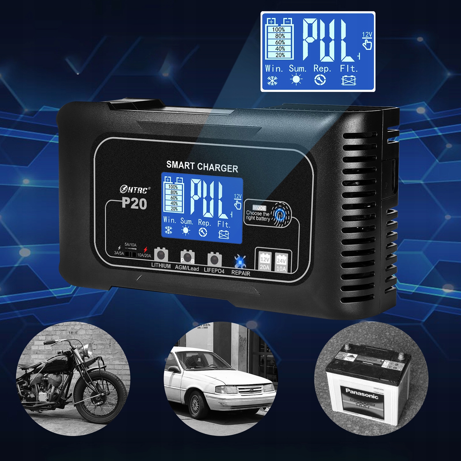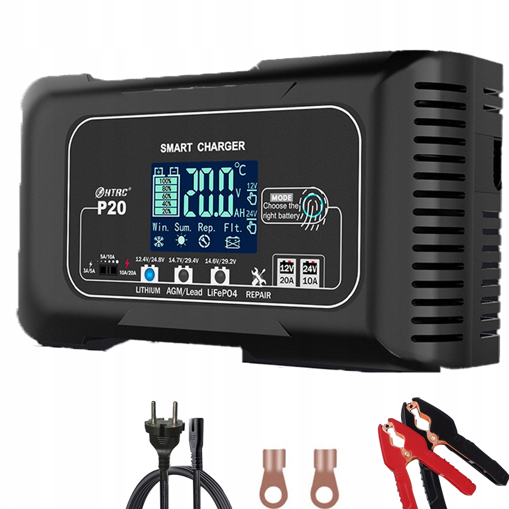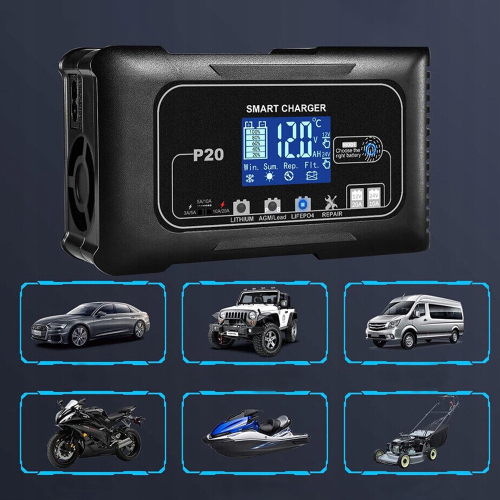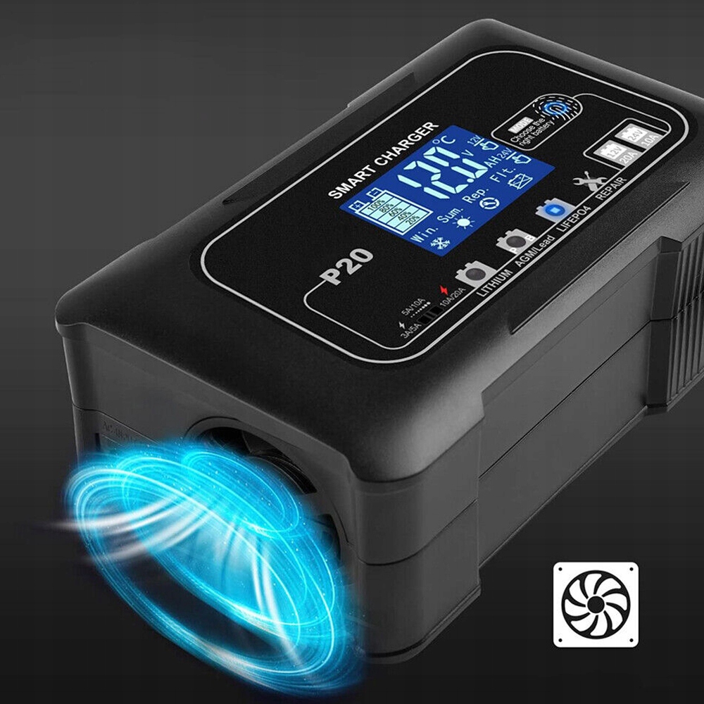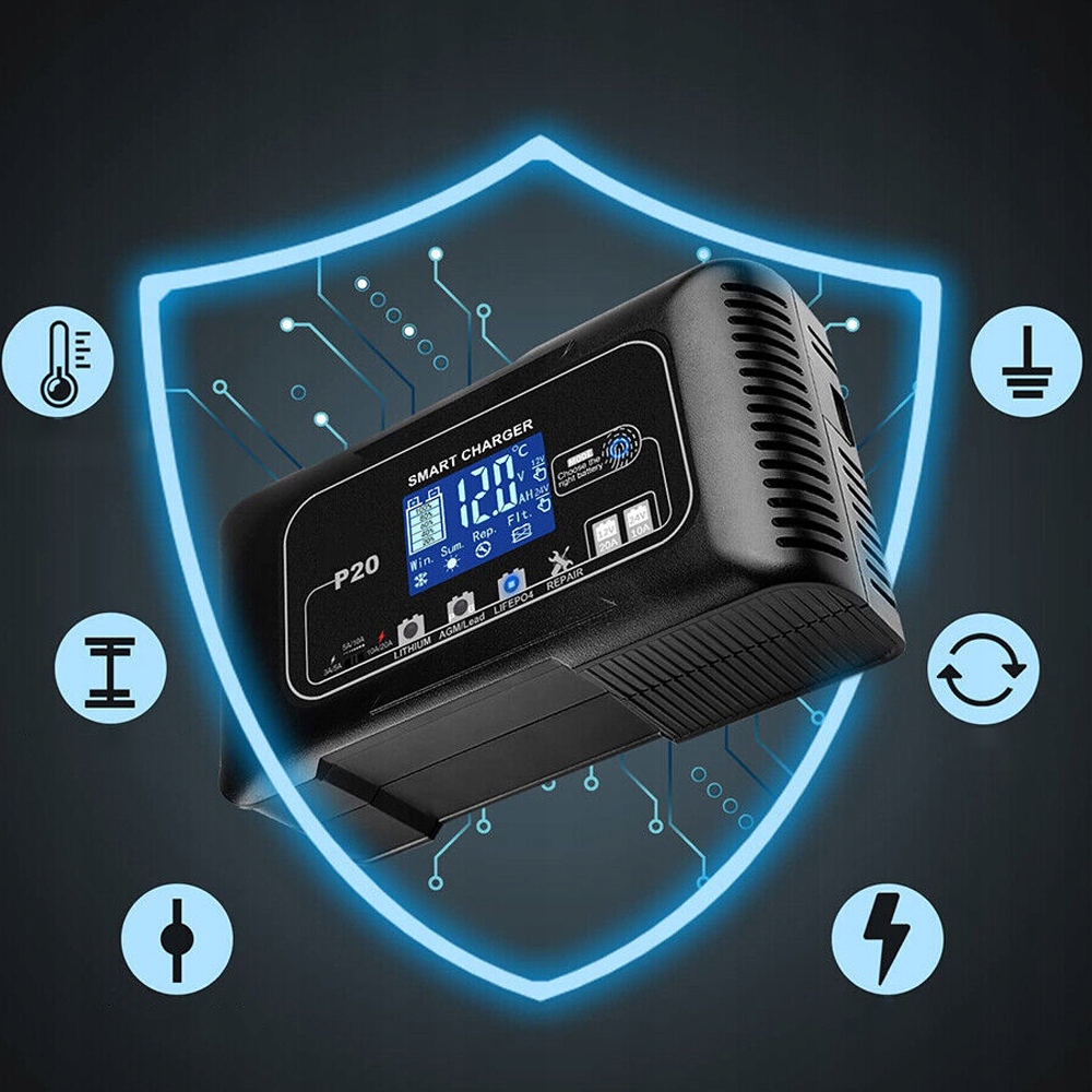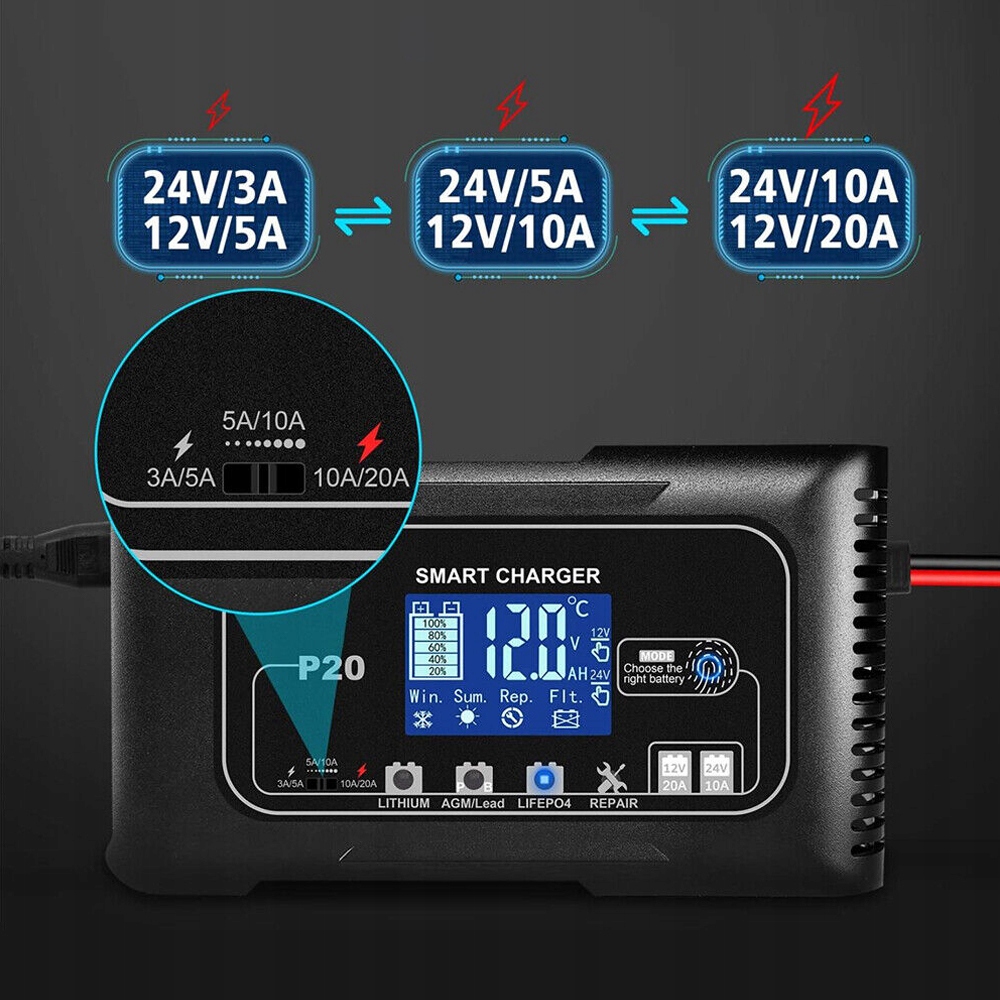 ✔️ Интеллектуальная зарядка: Автомобильное зарядное устройство использует 4 автоматических режима зарядки, включая литий, AGM/свинцово-кислотный, LiFePo4, Сервисы «Режим ремонта» используются для ремонта эффективных и слабых аккумуляторов. 3 уровня настройки тока: 3А/5А, 5А/10А, 10А/20А.