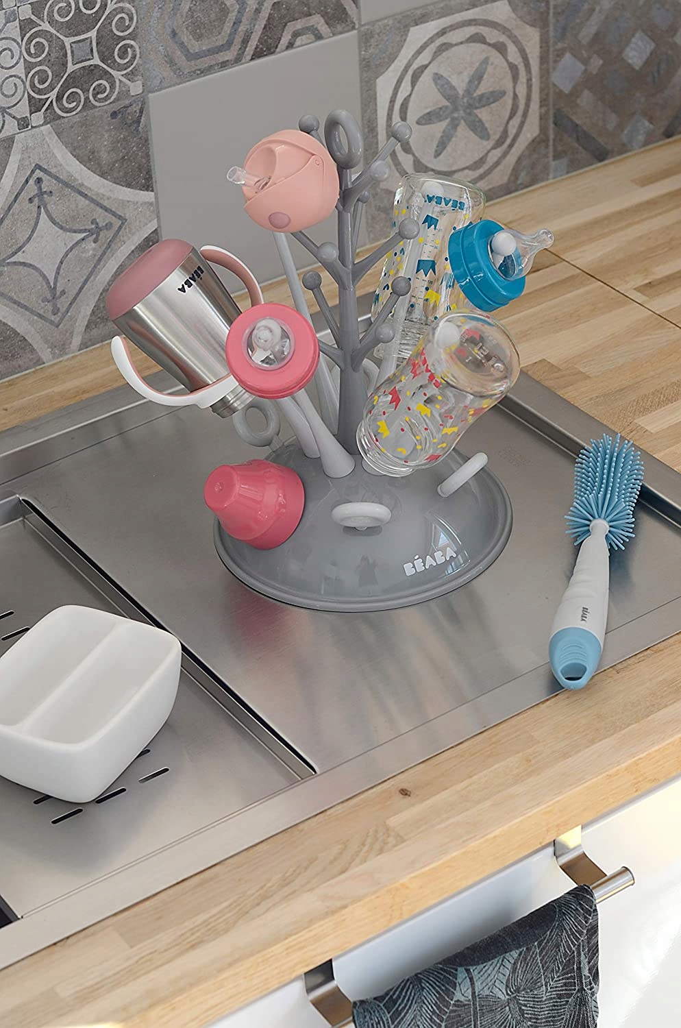 Практическая, современная сушилка для бутылок и другие аксессуары для кормления французской бренды beaba. У него есть дизайнерский вид - на серой основе есть серые вкладки с округлыми кончиками - в общей сложности 6 бутылок и 18 добавок будут подходить для них, такие как пустышки, орехи, крышки и т. Д.