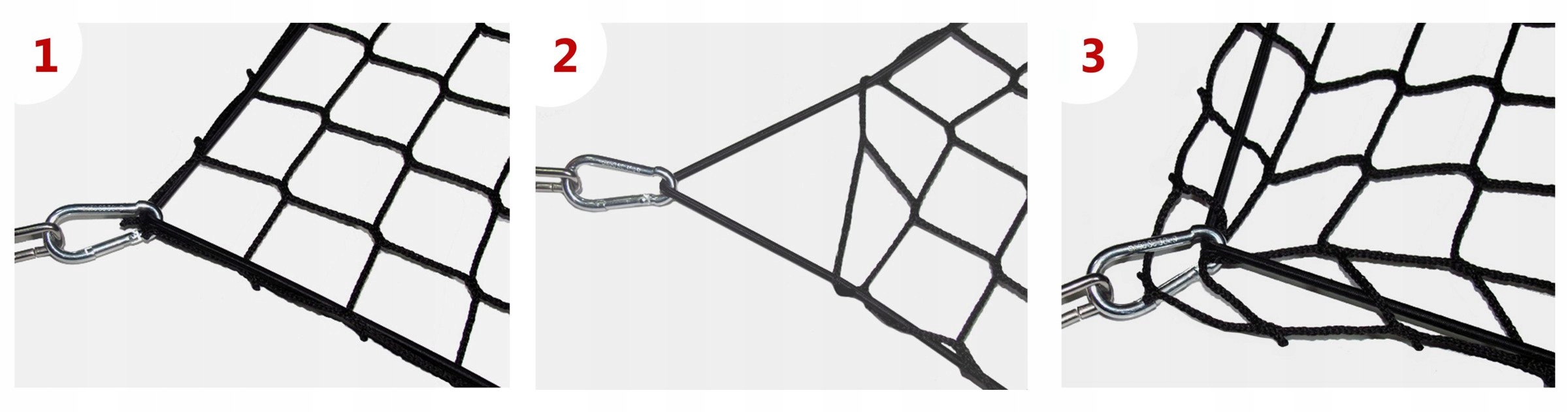 Сетка продается в комплекте с четырьмя карабинами, крепящимися к заводским крючкам в автомобиле.