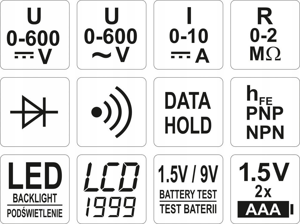 Универсальный измеритель YT-73081 с ручным диапазоном для каждого измерения позволяет выполнять базовые и расширенные электрические измерения. Дополнительной и полезной опцией является тест аккумулятора 1,5В и 9В, позволяющий проверить напряжение проверяемого аккумулятора под нагрузкой, что поможет оценить его состояние и исключить или подтвердить необходимость замены.