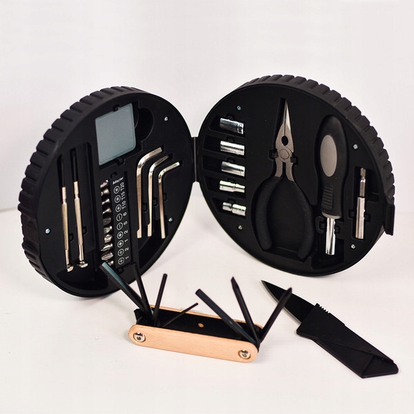 Стильный, складной, многофункциональный инструмент в деревянной обстановке. Он состоит из: 4 клавиш Allen, 1 плоская отвертка, 1 поперечная отвертка.