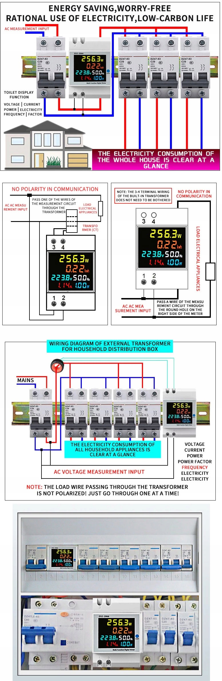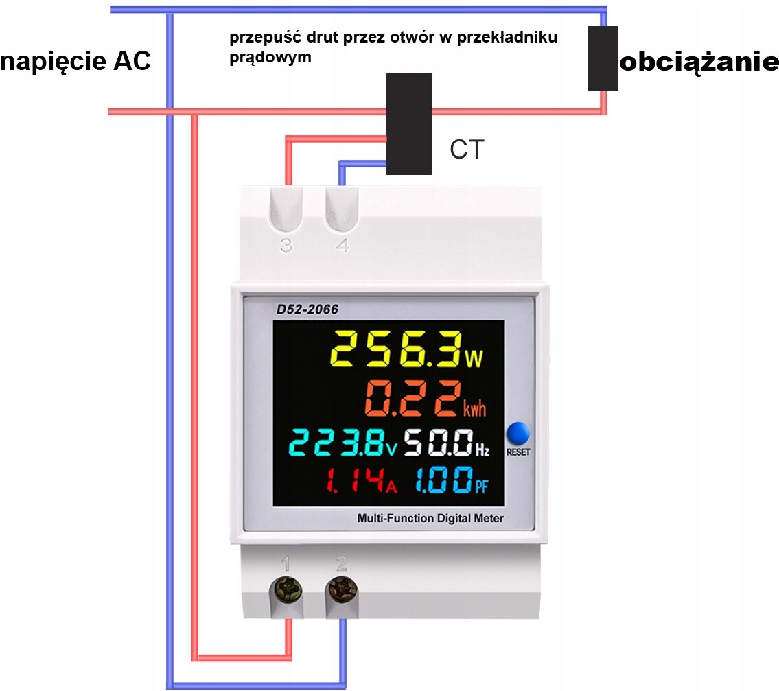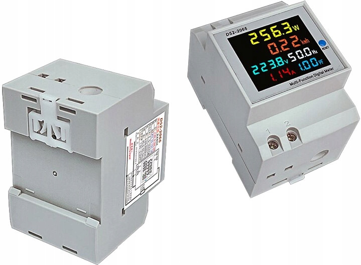 Многофункциональный D52-2066-метр позволяет измерять 6 различных электрических параметров переменного тока; Напряжения, электричество, мощность, энергопотребление, частота и коэффициент мощности COSφ. Корпус счетчика предназначен для установки на рельсе DIN TS35 мм. Результаты измерения представлены в разных цветах на ЖК -дисплее. Измерение тока проводится с использованием измерительной катушки, а не в стандартных решениях, основанных на измерении на сайдинге. Использование катушки не требует необходимости подключения последовательно к циклу цепи. Этого достаточно, чтобы перетаскивать один кабель с протекающим током через внутреннюю часть катушки.