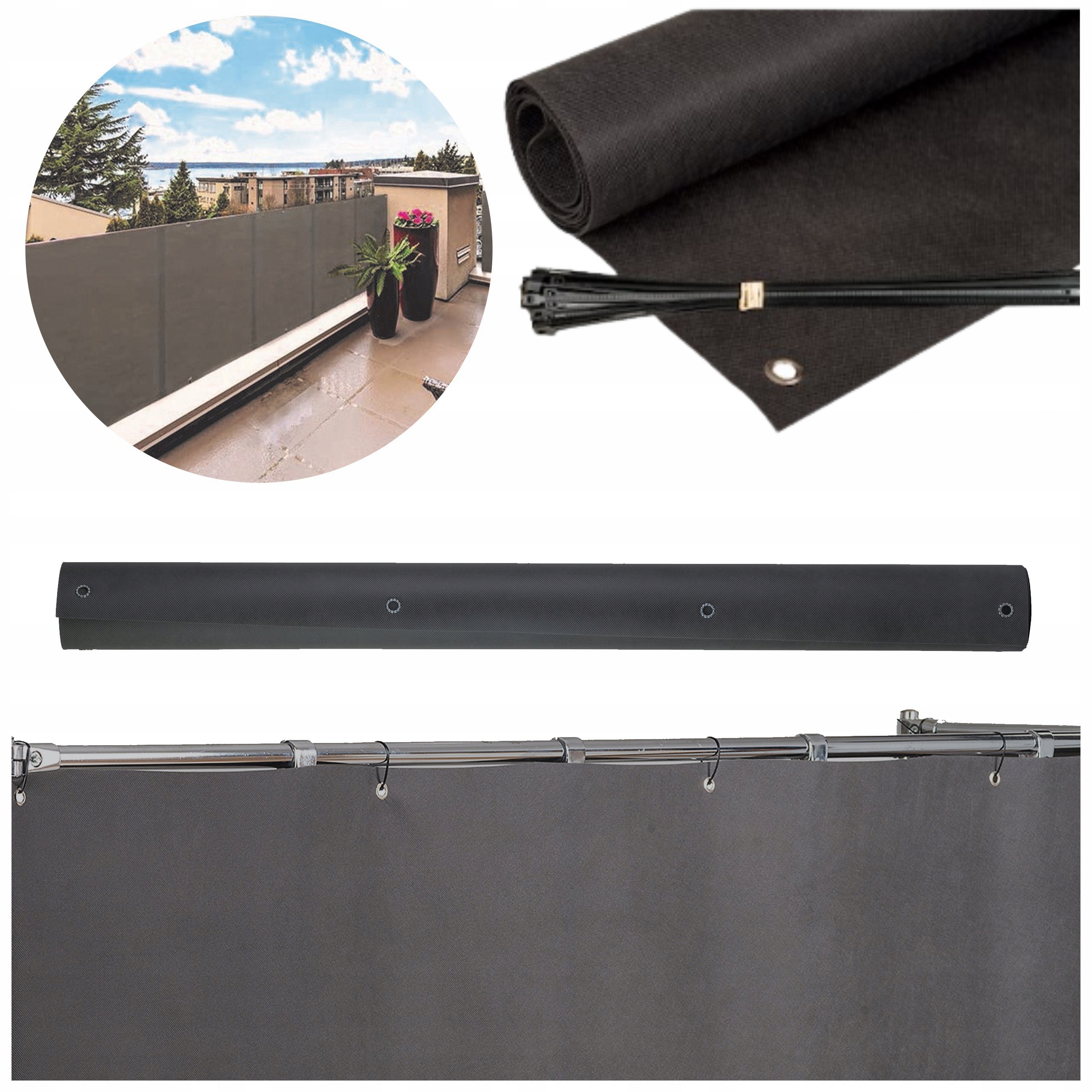 ➡ крышка может быть установлена на внутренней или внешней стороне балкона, прикрепляя ее к барьерам в каждом кожаном глаза, используя полосы зажима.