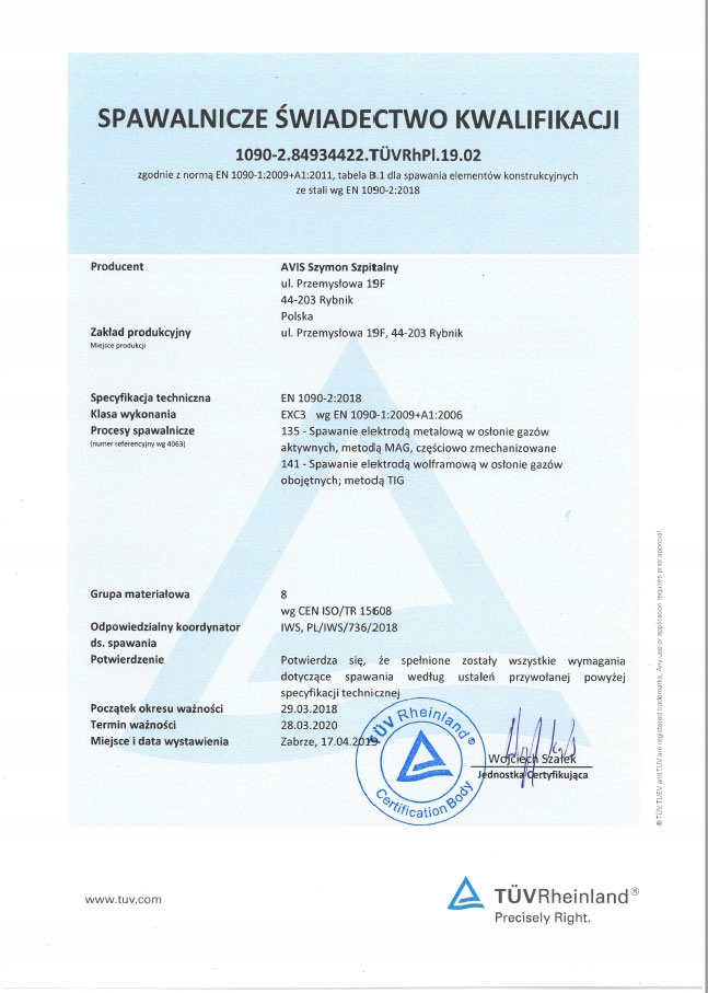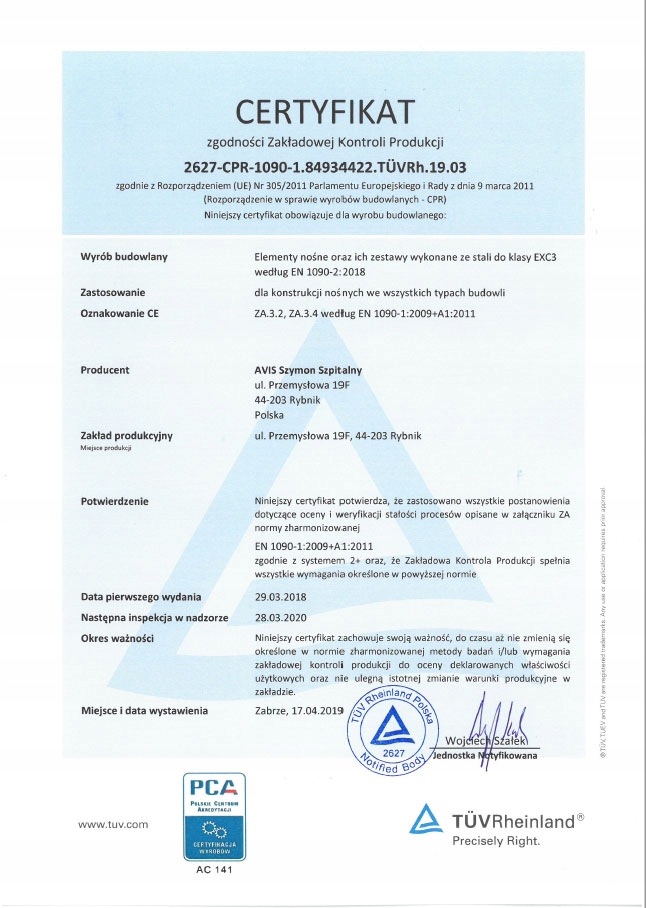 Повышая качество предлагаемой продукции, наша компания успешно прошла процедуру сертификации по стандарту PN-EN 1090, устанавливающему стандарты в области производства, в том числе. стальные конструкции. Сертификацию в этой области провел лидер рынка сертификационных и исследовательских услуг в Польше – TÜV Rheinland.