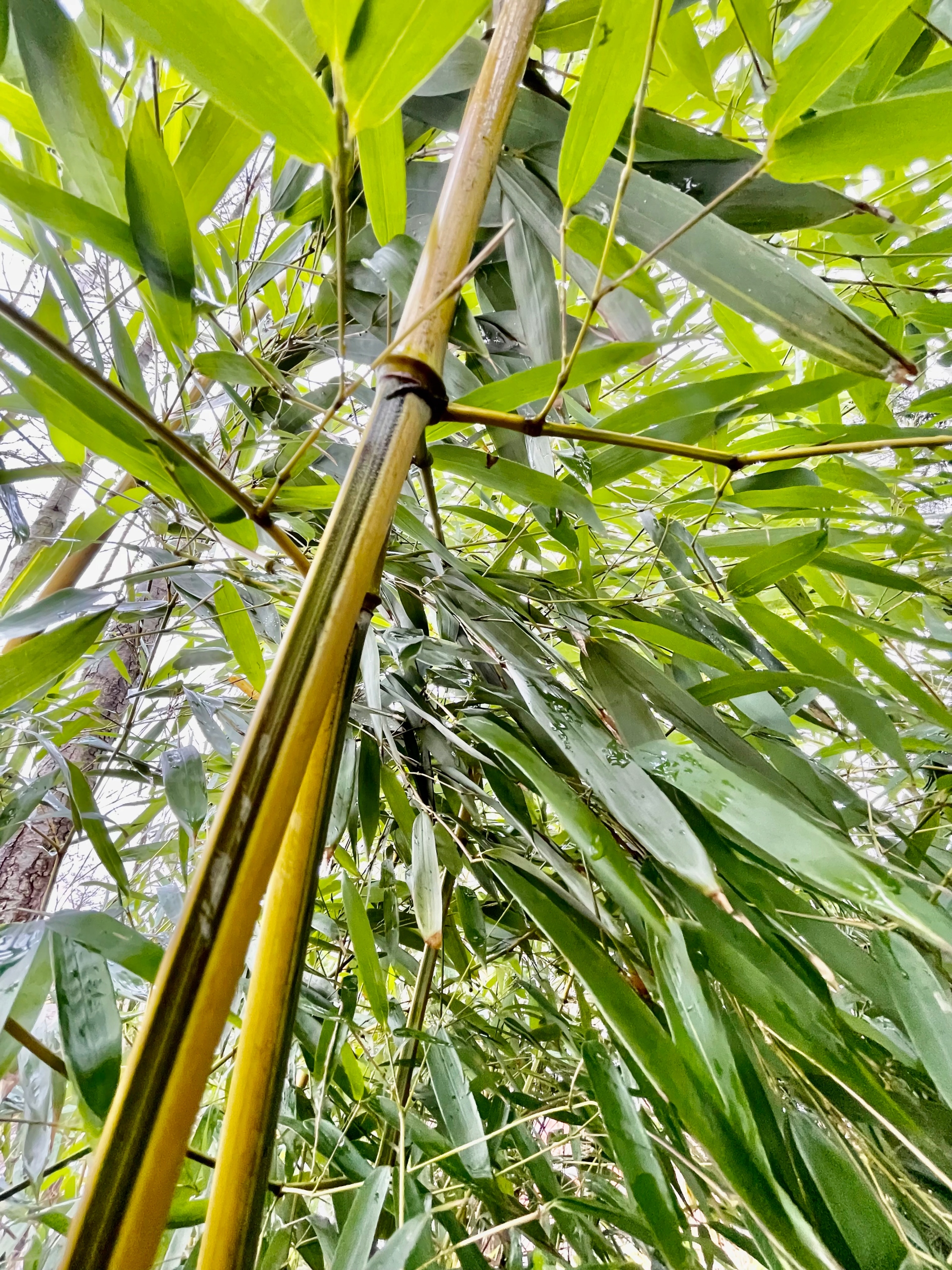 Один из самых популярных древесных бамбука из -за их красивых желтых побегов с зеленым характерным ремешком. Темно -зеленые листья идеально контрастируют со стеблями.