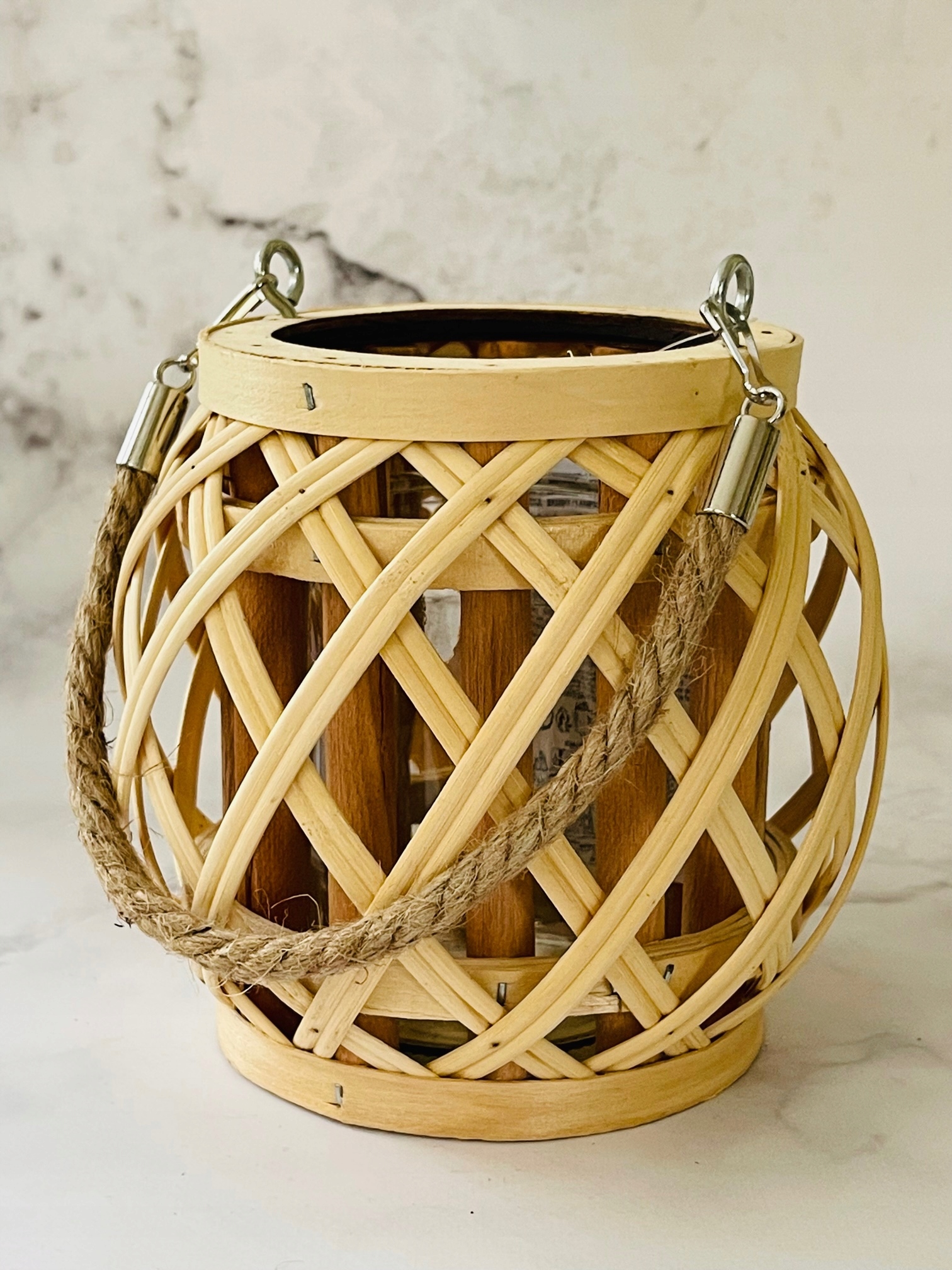 Плетеный фонарь с местом для небольшой свечи или чайной свечи. Очень атмосферно смотрится вечерами на балконе или в саду. Этот замечательный фонарь изготовлен из натуральных материалов: дерева (бамбука), стекла и джутовой веревки. Выглядит красиво.