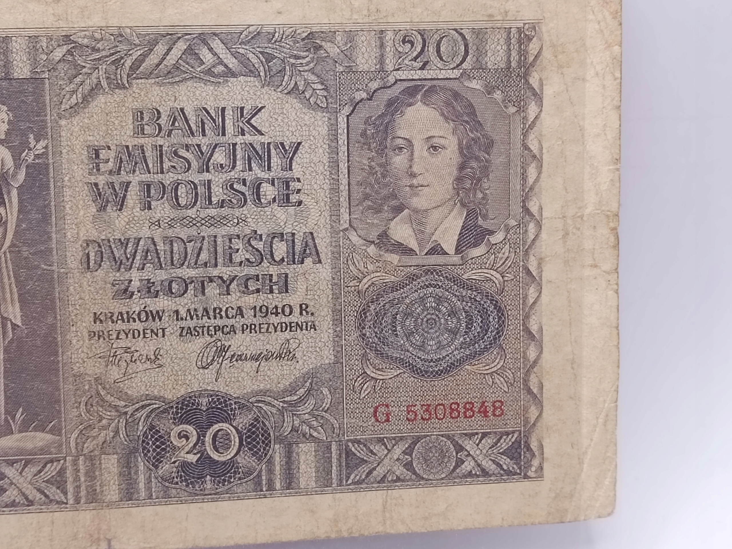 Банкнот pln 20 двадцать Zlotys Krakow 1 марта 1940 года. Серия G 5308848