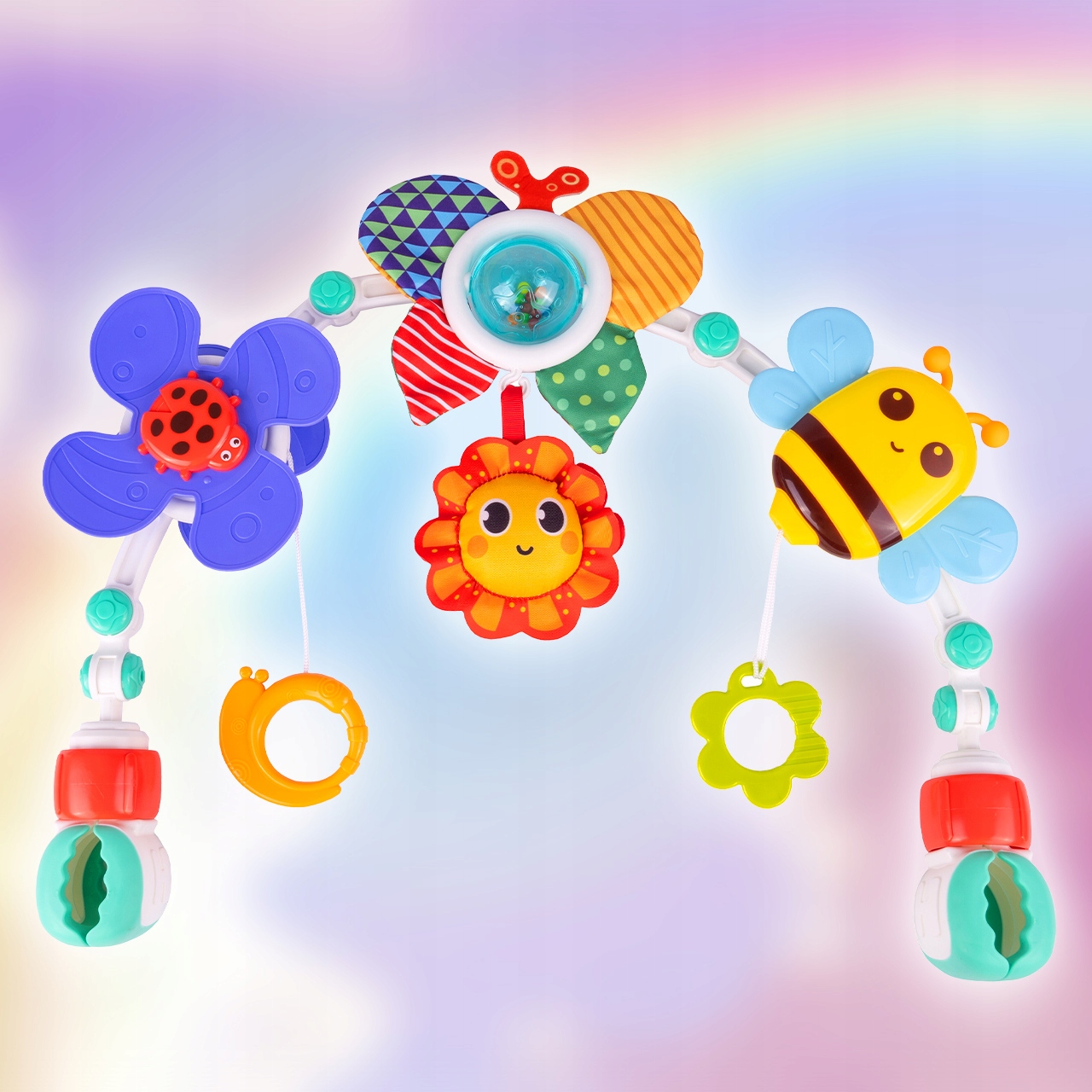 Игрушка привлекает внимание и удерживает ребенок активен и любопытен, находясь в коляске или автокресле. Предназначен для развития движений всего тела и воздействия на органы чувств.