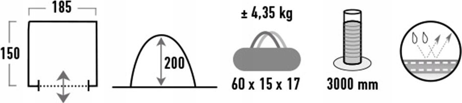 Выбрав павильон High Peak, ваше пребывание в окружении природы станет еще более комфортным. Технические данные: · Размеры: 150 см x 185 см x 200 см · Размеры в сложенном виде: 60 см x 15 см x 17 см · Каркас: стекловолокно 11 мм/9,5 мм · Водостойкость: 3000 мм воды колонка · Крючок для солнечного душа