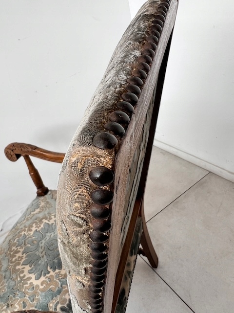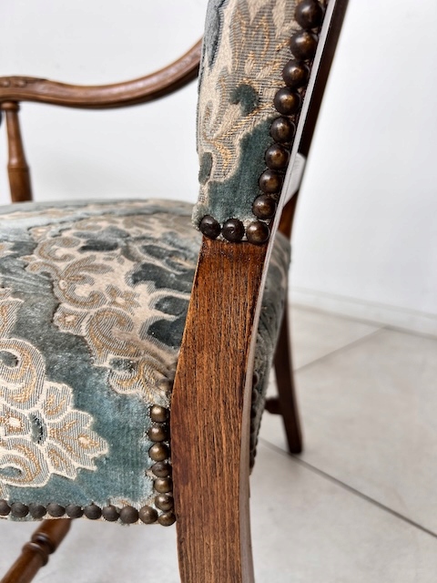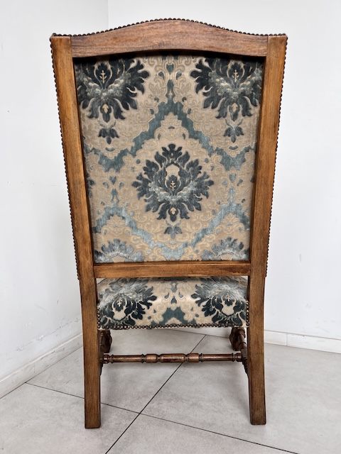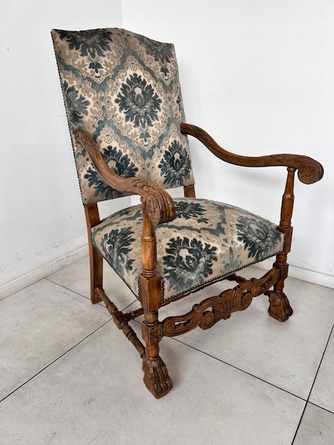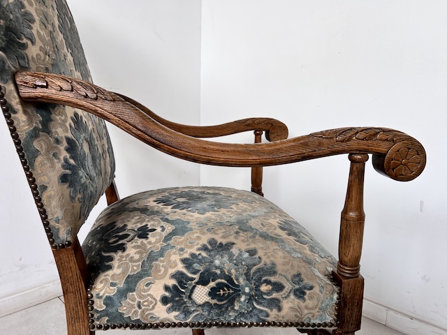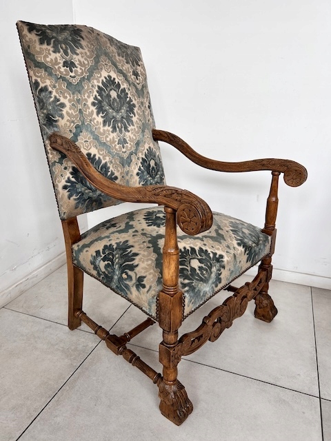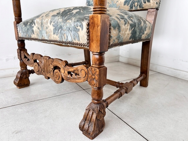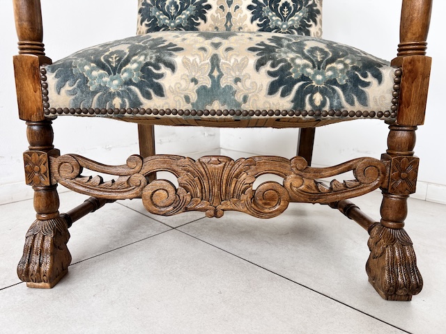 Baroque -Style Crigchair. Эффективная Большое, массивное кресло, обычно называемое «трон». Сделано из твердой древесины. Стабильная и тяжелая структура. Резные ноги, заканчиваемые декоративным когтям льва. Нижняя передняя и подлокотники также украшены. Обивка, сделанная из Жаккарда в классическом узоре. Это в красивых оттенках синего крема, с металлическими шпильками на краю. Задняя часть и сиденье мягкие и удобные. В кресле есть типичные признаки использования, но ущерб нет. Это хорошо. Идеально подходит для классических интерьеров, офиса или в качестве декоративного стула. Готов вставить.