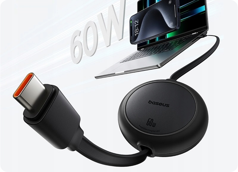Программный дизайн: Инновационная система кабельного рулона обеспечивает легкую адаптацию своей длины к индивидуальным потребностям, что значительно облегчает управление пространством и хранение. Заряжая MacBook Pro с 2021 до 41% за 30 минут и iPhone 15 Pro до 57% одновременно.