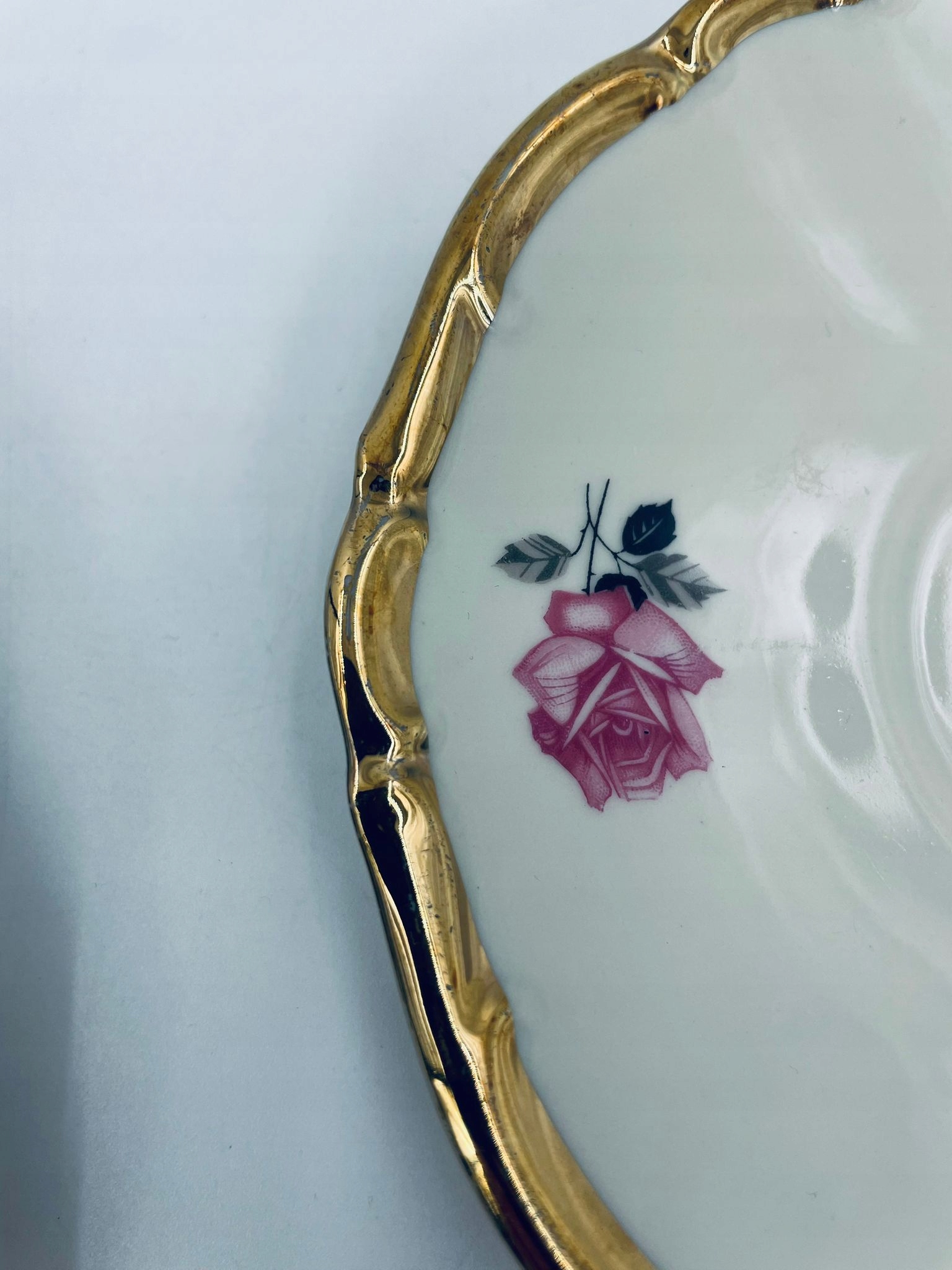чашка включена в набор трио Боретер Уолдссена Бавария. Высококачественный экру фарфор с нежным цветочным рисунком розового розового на ветвях в черном и сером. Набор завершился позолочкой по краям. Нежные ссадины в позолочке.