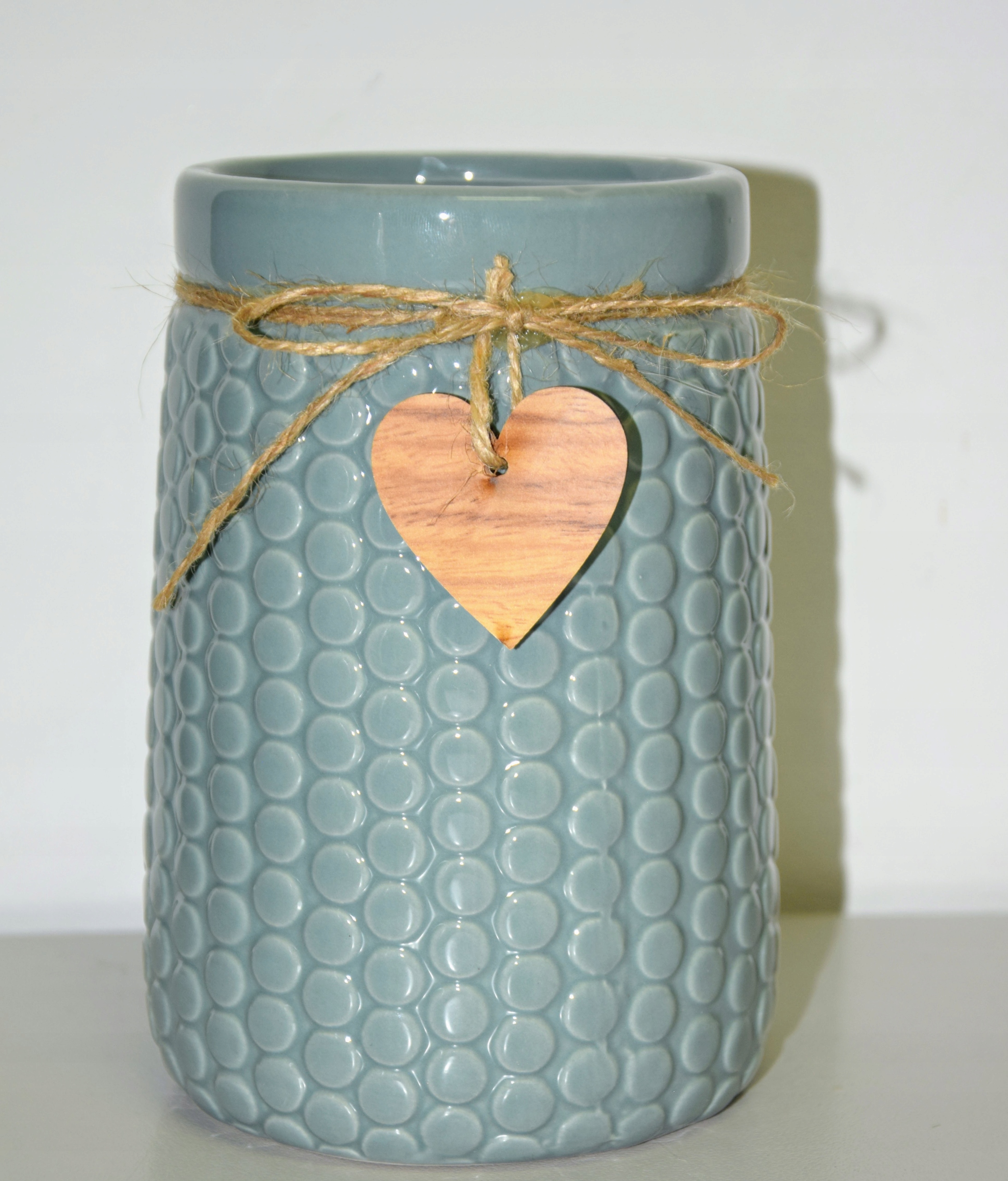 - украшена джутовой веревкой и деревянной подвеской в форме сердца.