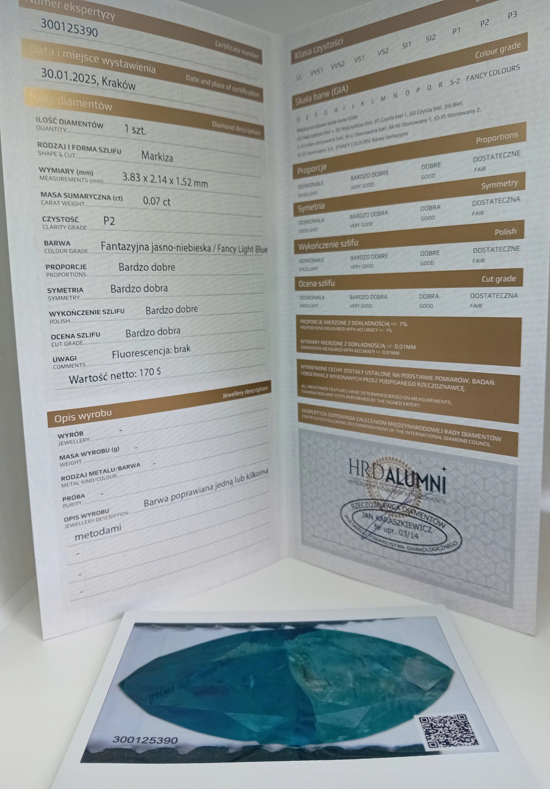 Алмаз прикреплен к C ertyft Эксперты по польскому геммологическому обществу - Diamond Sky, работающий в течение 30 лет на польском рынке