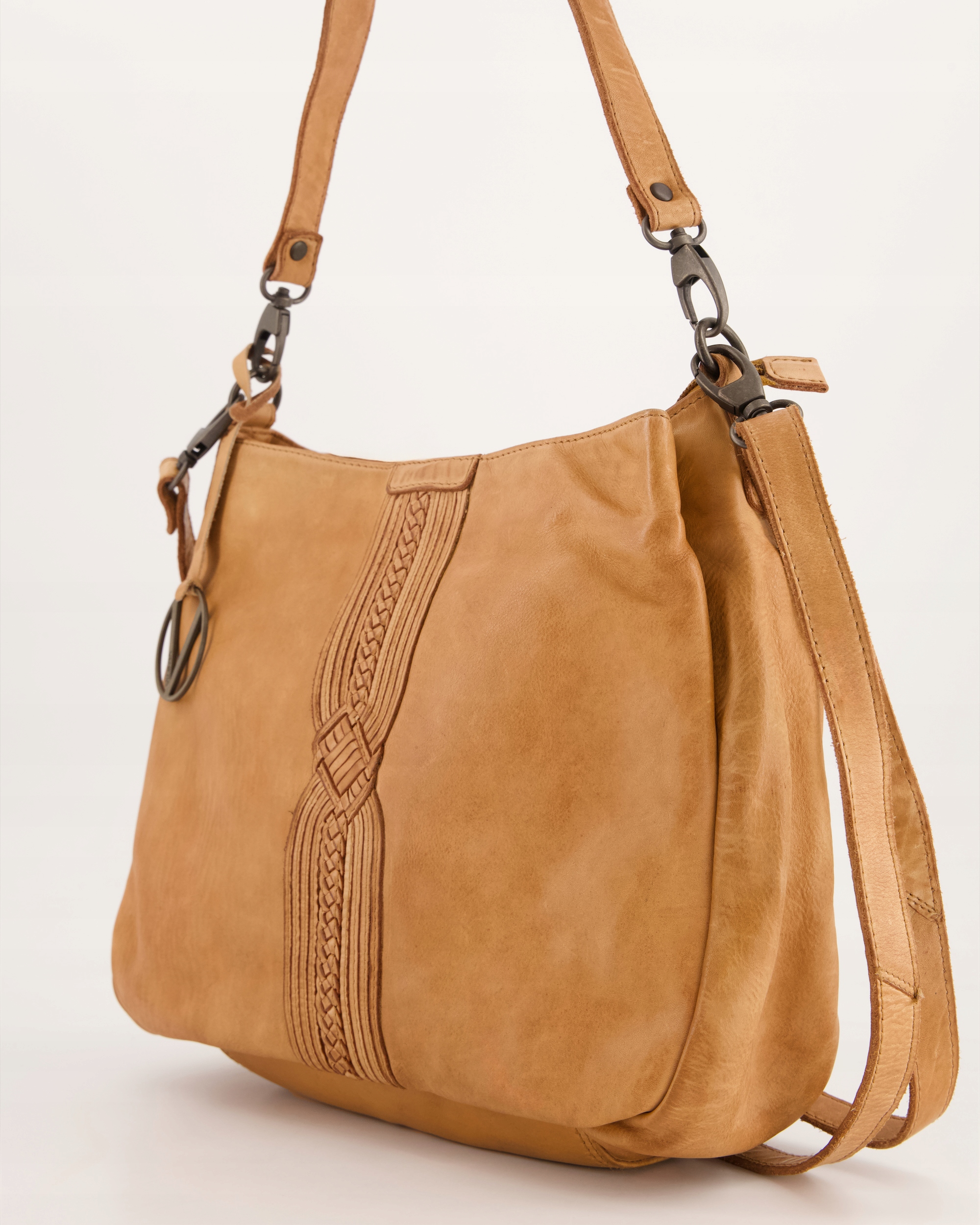 Бежевая кожаная сумка с классической формой с декоративным кожаным нанесением спереди. Изготовленный из мягкой натуральной кожи, он имеет средний размер, который идеально подходит для хранения наиболее необходимых вещей. Оснащен длинной, удобной кожаной ручкой на плече и съемным, регулируемым ремнем, который позволяет носить его также по диагонали. Классический вырез и нейтральный цвет делают сумку во многих случаях.