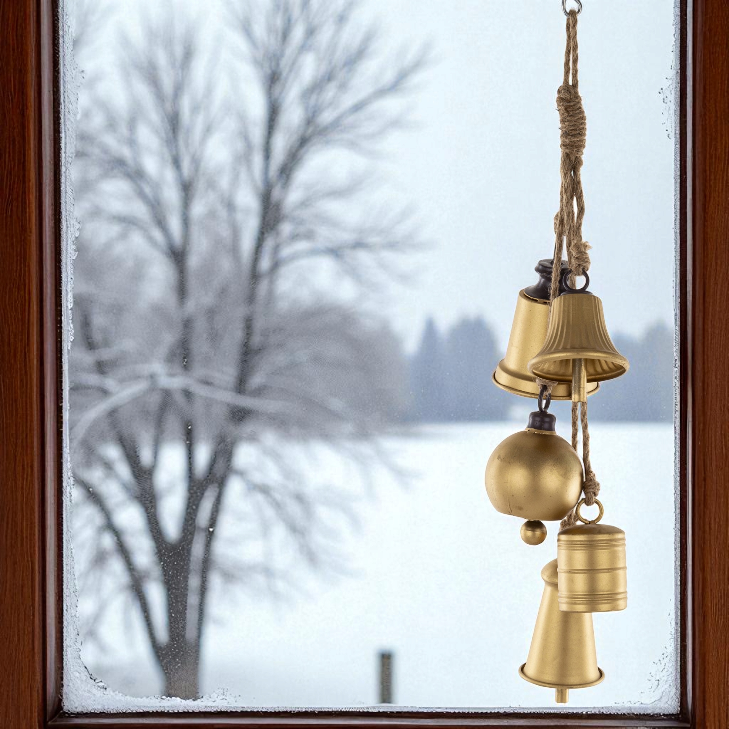 Элегантная гирлянда, сделанная из металлических колоколов в золотом цвете, является уникальным украшением, которое будет работать не только во время праздничного сезона, но и как внутреннее украшение в течение года. Несколько колокольчиков разных форм, подвешенных на естественной джутовой веревке, дают целый стильный, деревенский характер.
