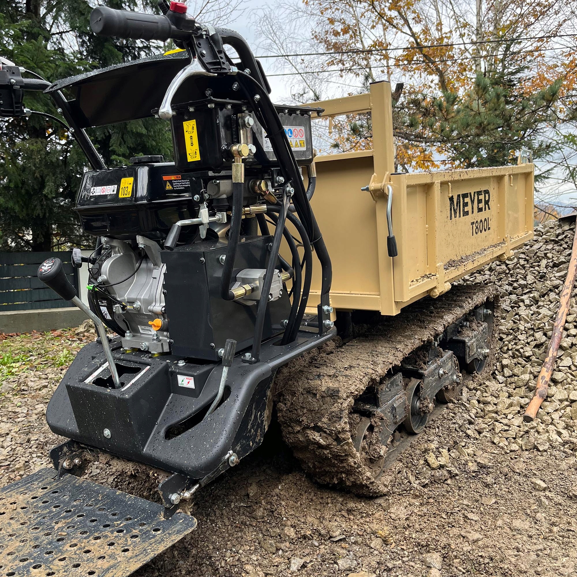 Мини-самосвал MEYER T800L — это универсальный гусеничный самосвал с бензиновым двигателем, опрокидывающей гидравликой и платформой оператора.